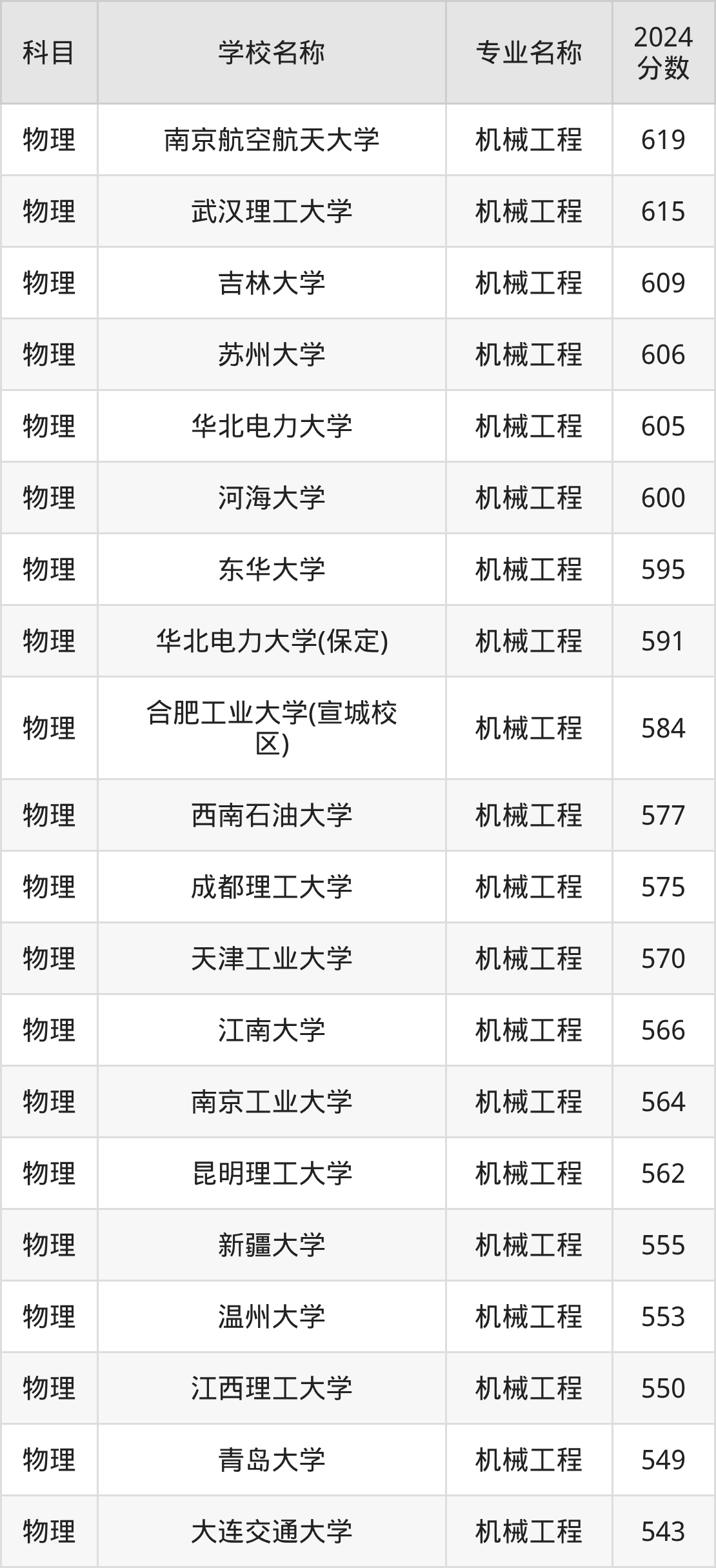 通过上文大家可以知晓,在广西壮族自治区内招机械工程专业的院校数量较少,所以下文将为2026届高考生继续展示:壮族自治区外大学的机械工程专业2024年在广西高考的录取情况,包含南京航空航天大学、武汉理工大学、吉林大学、苏州大学、华北电力大学。