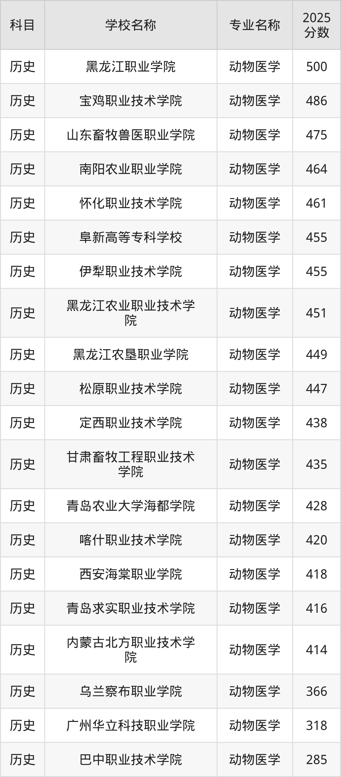 通过上文大家可以知晓,在河北省内招动物医学专业的院校数量较少,所以下文将为2026届高考生继续展示:省外大学的动物医学专业2025年在河北高考的录取情况,包含黑龙江职业学院、宝鸡职业技术学院、山东畜牧兽医职业学院、南阳农业职业学院、怀化职业技术学院。