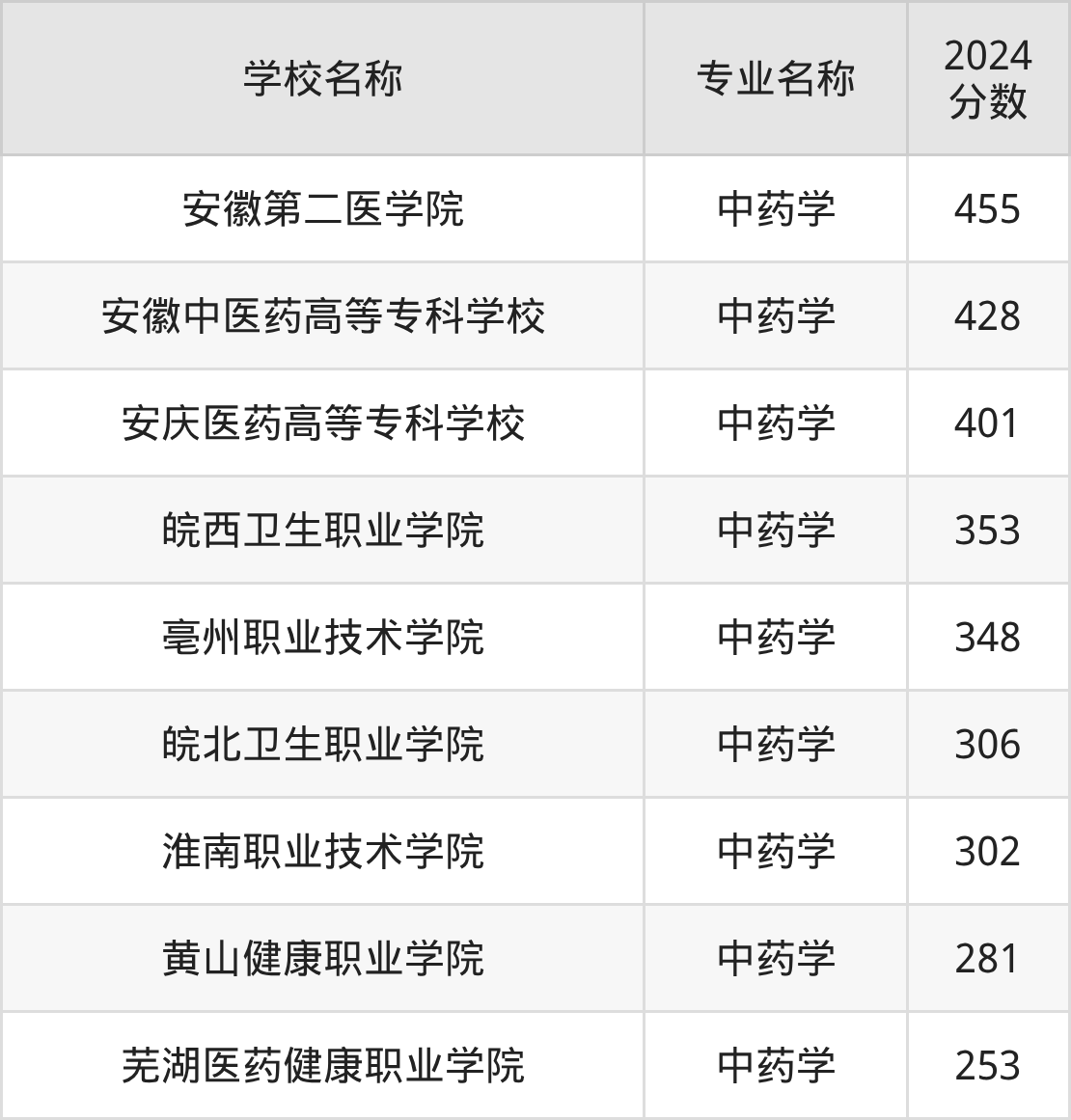 | 安徽中医药高等专科学 校 | 中药学 | 441 |