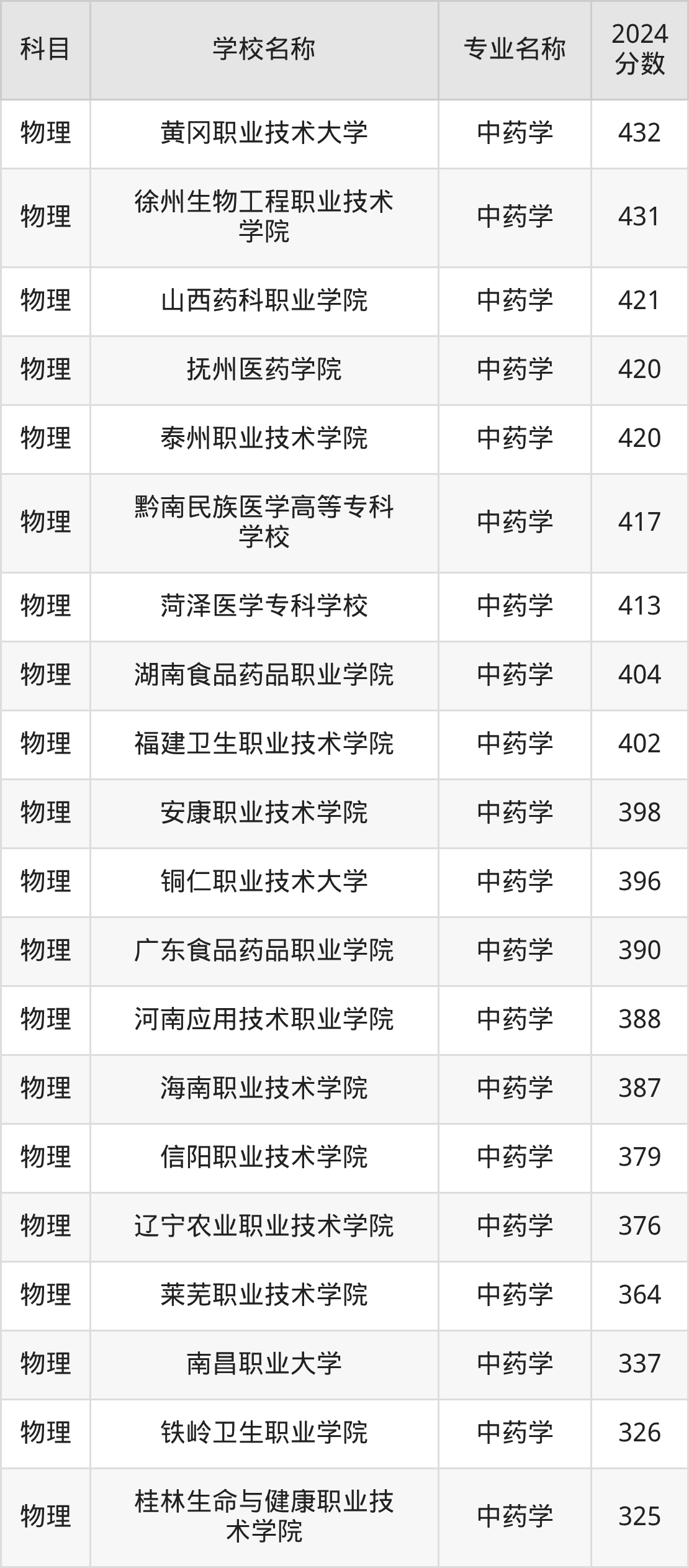 | 皖北卫生职业学院 | 中药学 | 325 |