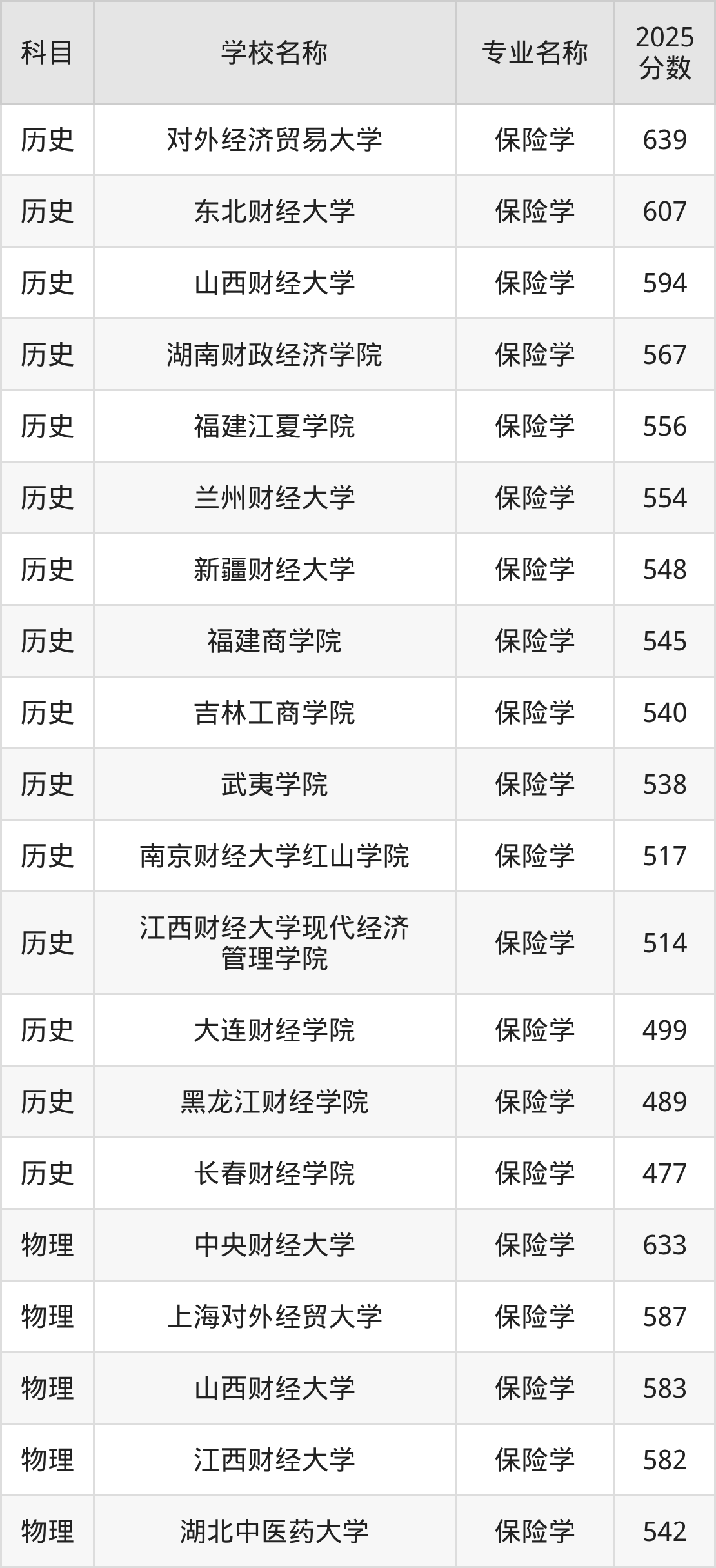 通过上文大家可以知晓,在河北省内招保险学专业的院校数量较少,所以下文将为2026届高考生继续展示:省外大学的保险学专业2025年在河北高考的录取情况,包含对外经济贸易大学、东北财经大学、山西财经大学、湖南财政经济学院、福建江夏学院。