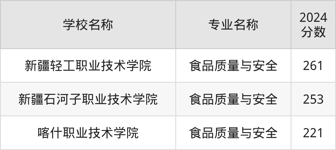 | 新疆石河子职业技术学 院 | 食品质量与安全 | 233 |