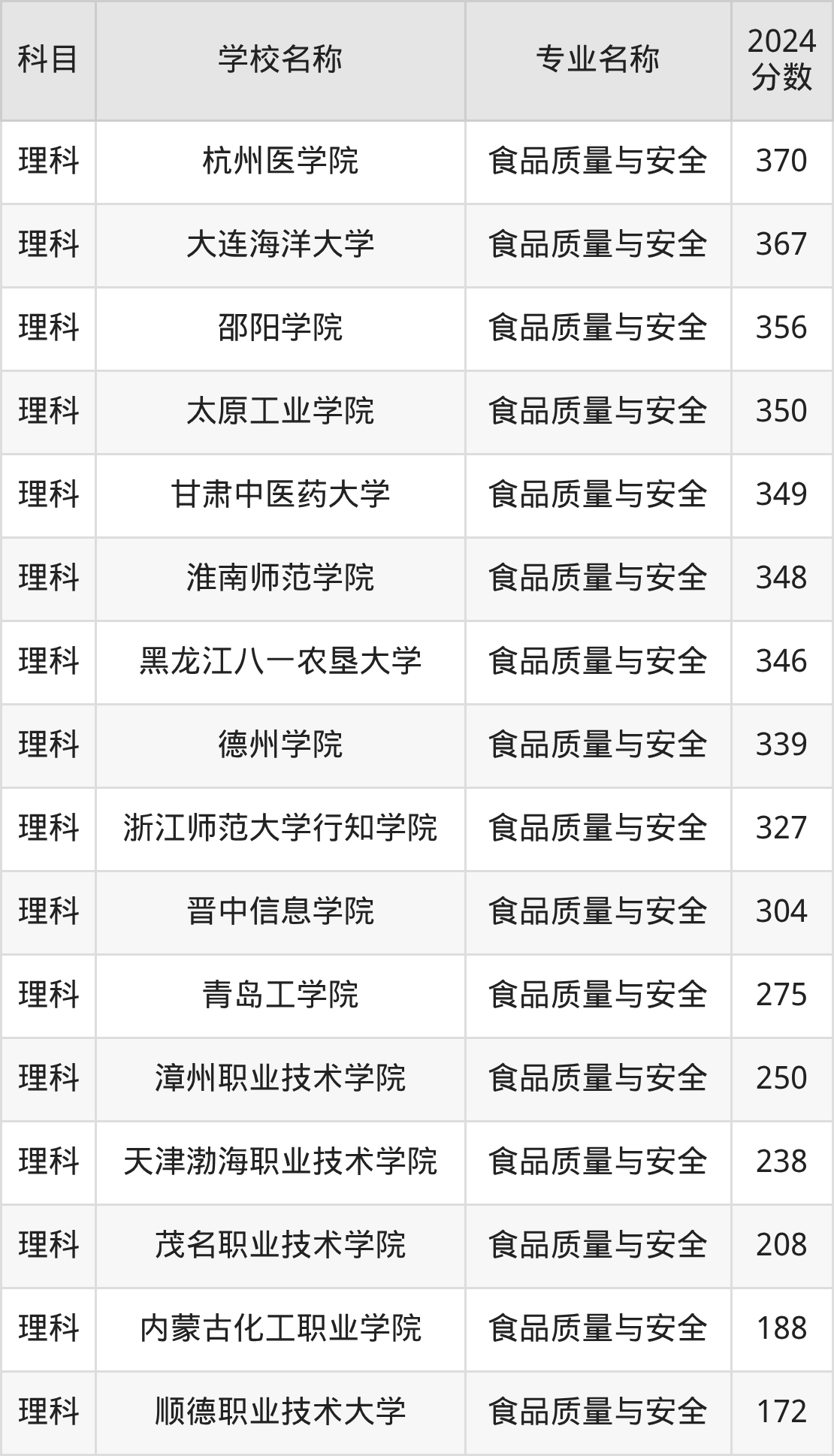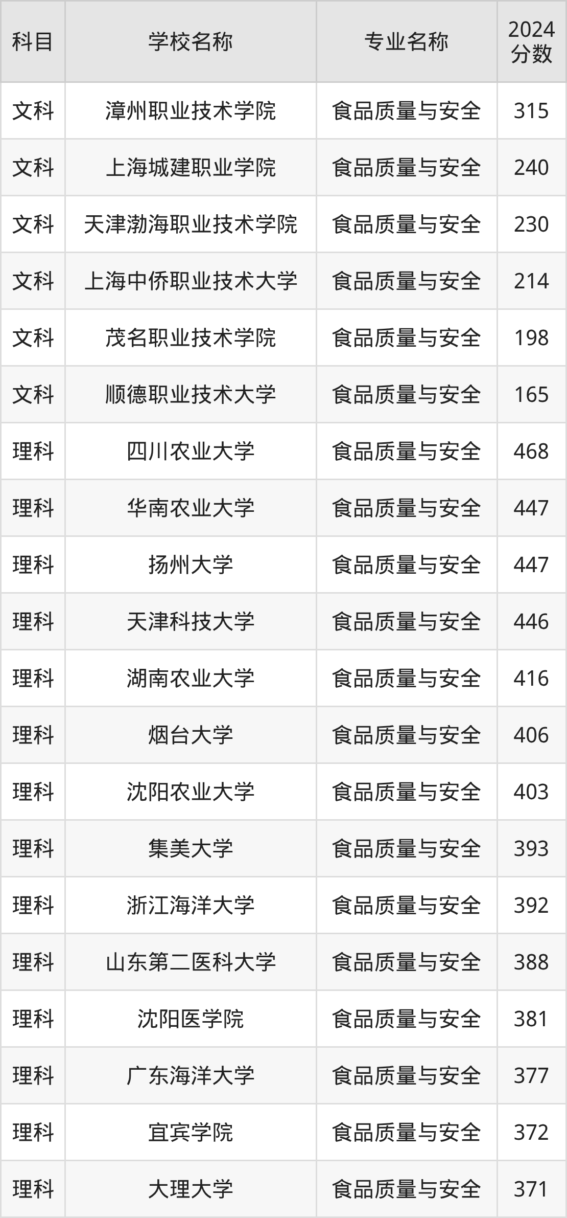 新疆高考理科:食品质量与安全专业的最低分是188分~376分