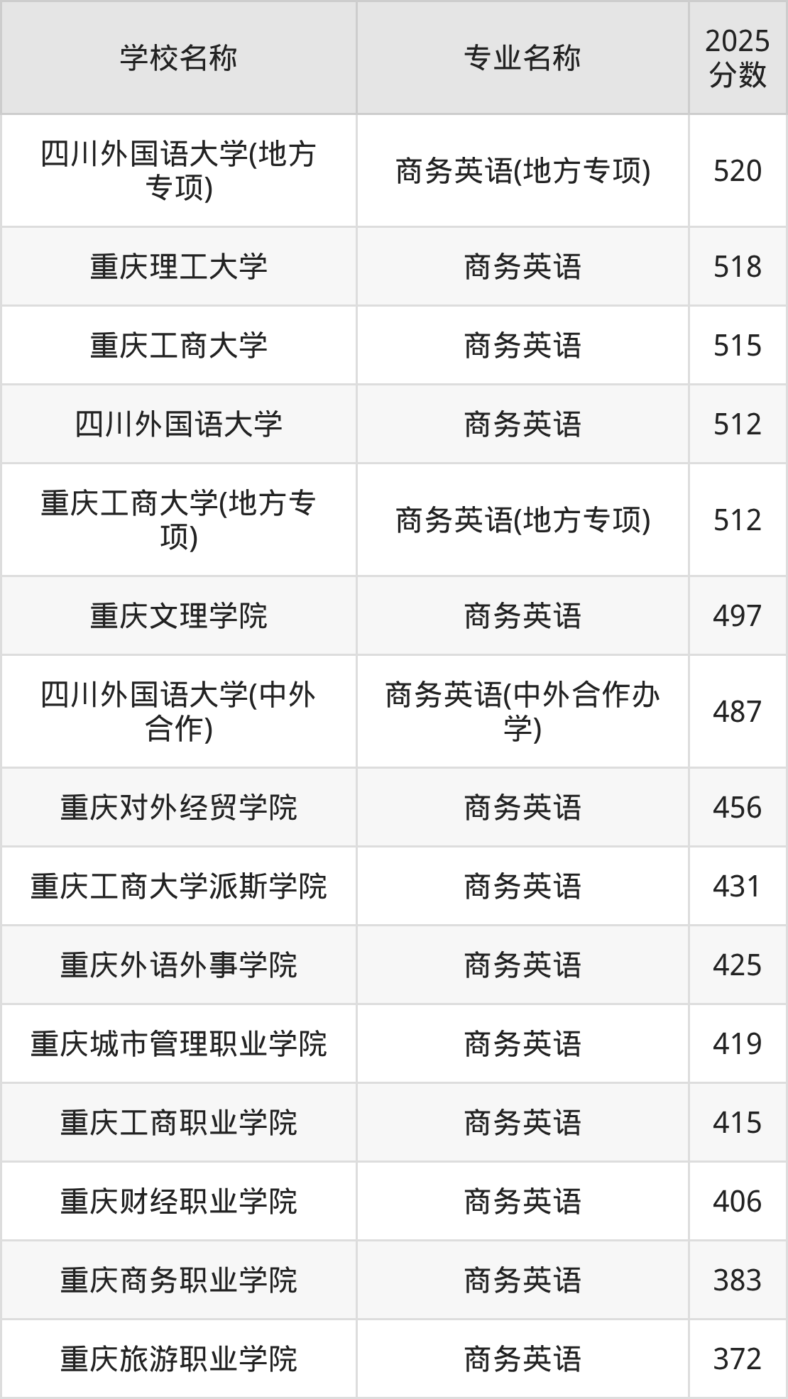 | 重庆财经职业学院 | 商务英语 | 416 |