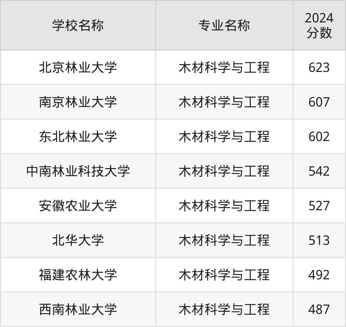 通过上文大家可以知晓,在浙江省内招木材科学与工程专业的院校数量较少,所以下文将为2025届高考生继续展示:省外大学的木材科学与工程专业2024年在浙江高考的录取情况,包含北京林业大学、南京林业大学、东北林业大学、中南林业科技大学、安徽农业大学。
