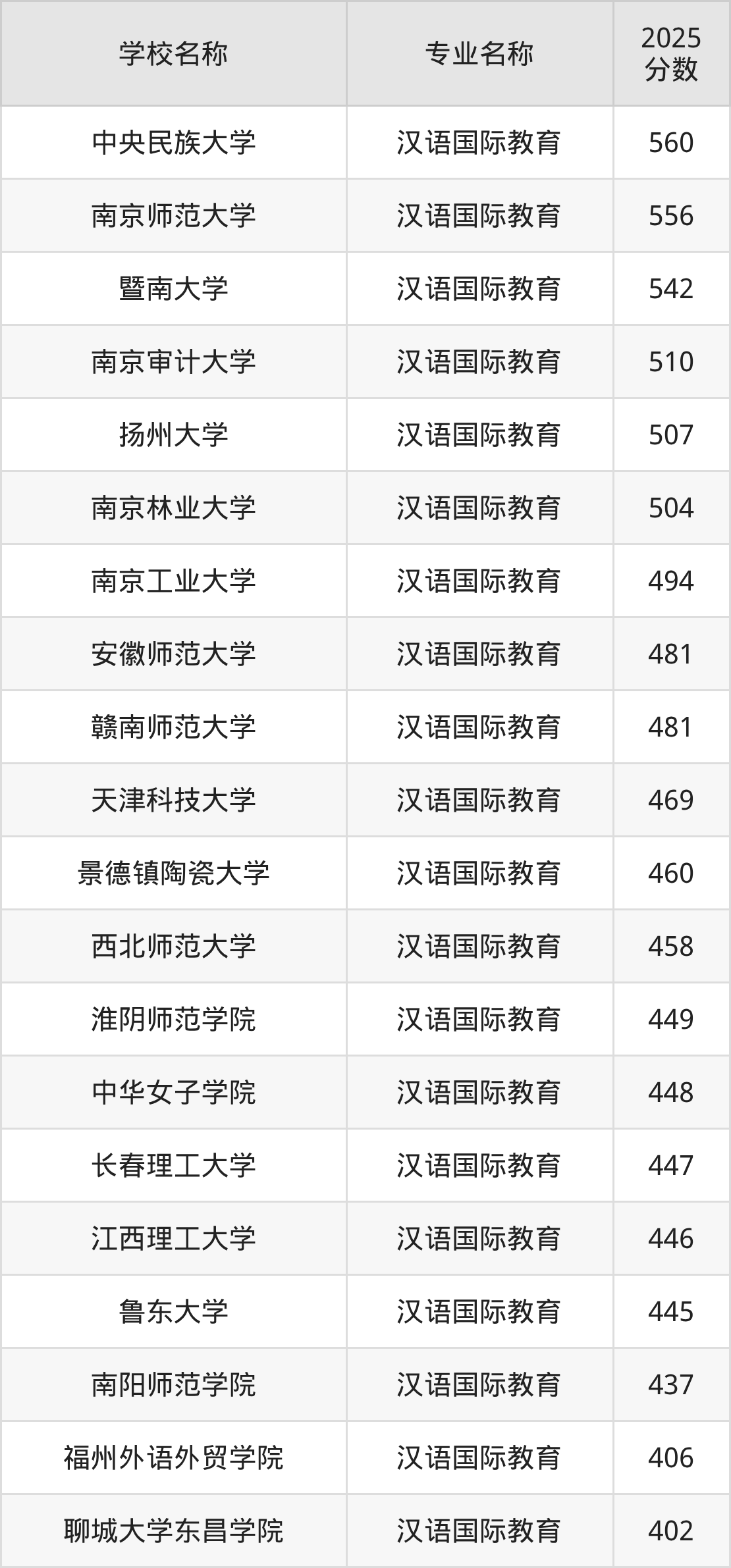 通过上文大家可以知晓,在上海市内招汉语国际教育专业的院校数量较少,所以下文将为2026届高考生继续展示:市外大学的汉语国际教育专业2025年在上海高考的录取情况,包含中央民族大学、南京师范大学、暨南大学、南京审计大学、扬州大学。