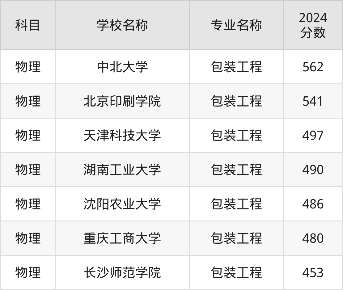 通过上文大家可以知晓,在黑龙江省内招包装工程专业的院校数量较少,所以下文将为2026届高考生继续展示:省外大学的包装工程专业2024年在黑龙江高考的录取情况,包含中北大学、北京印刷学院、天津科技大学、湖南工业大学、沈阳农业大学。