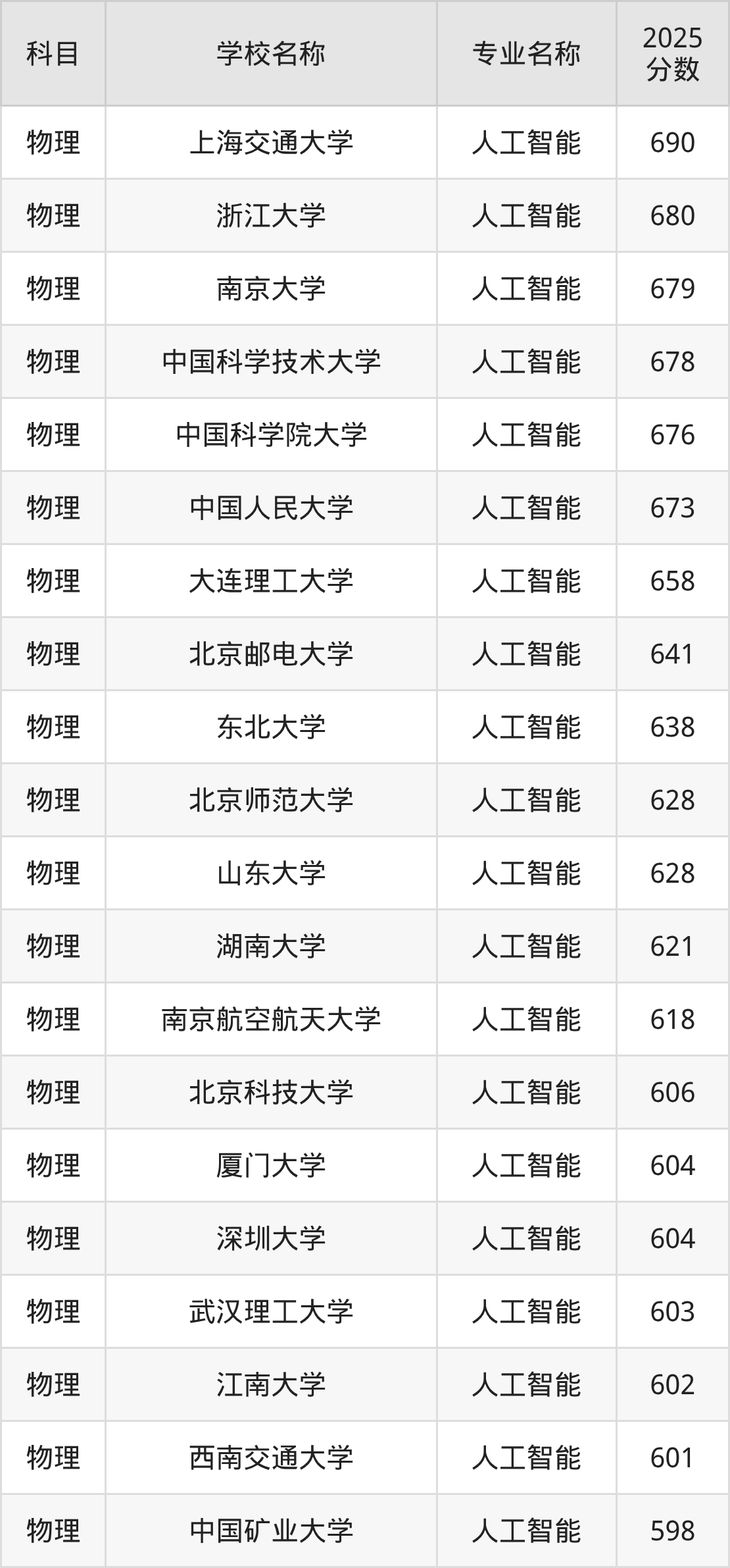 | 吉林大学 | 人工智能(王湘 浩班) | 642 |