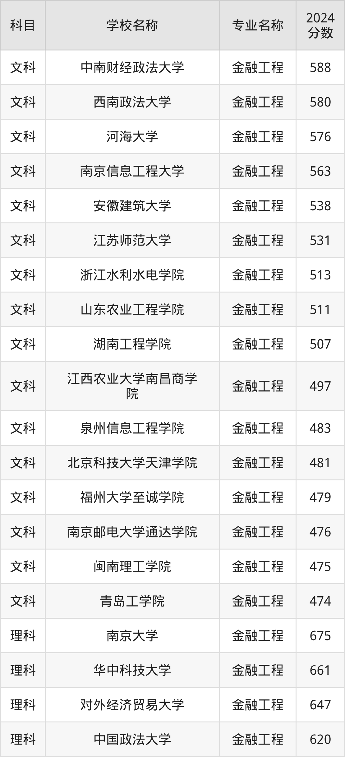 通过上文大家可以知晓,在四川省内招金融工程专业的院校数量较少,所以下文将为2026届高考生继续展示:省外大学的金融工程专业2024年在四川高考的录取情况,包含中南财经政法大学、西南政法大学、河海大学、南京信息工程大学、安徽建筑大学。