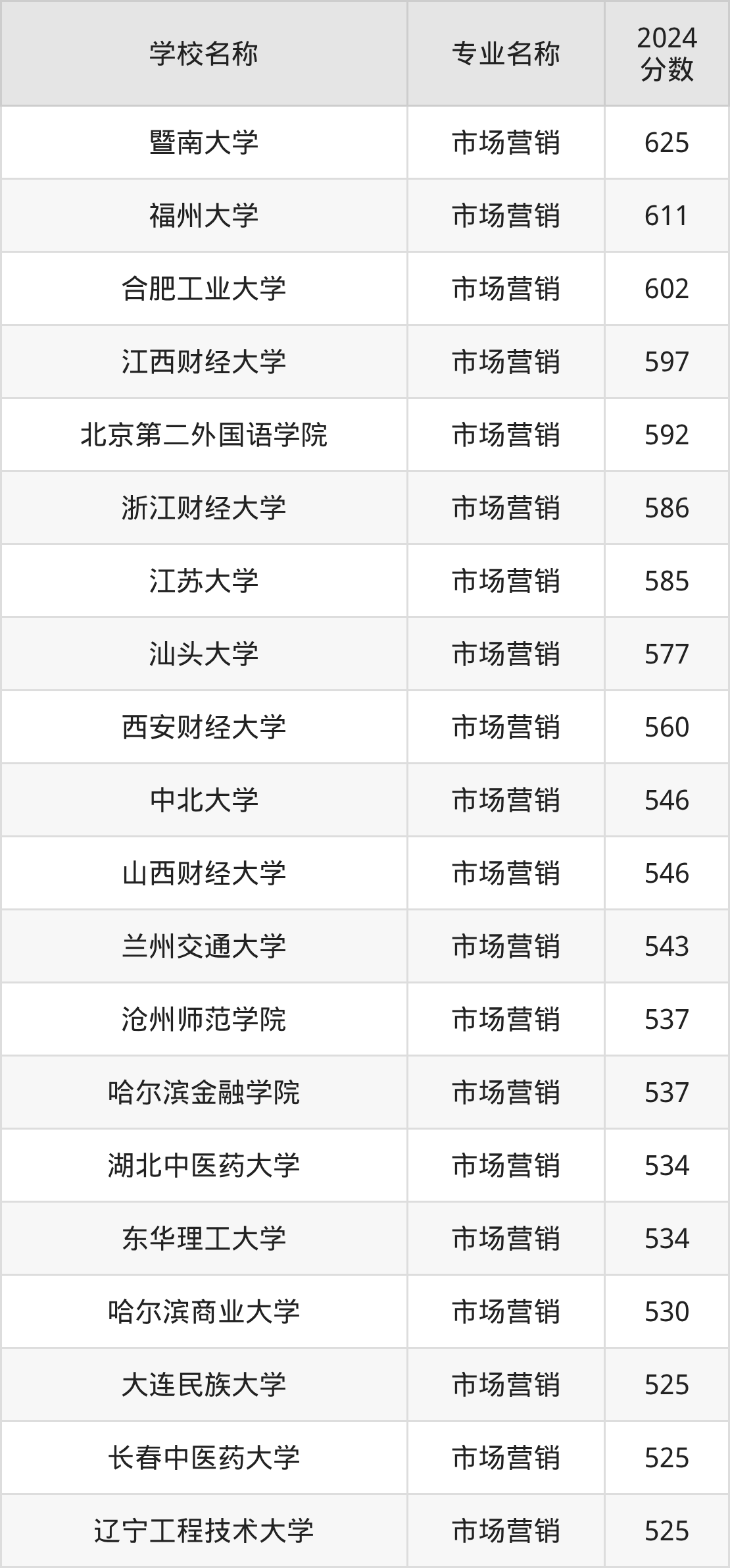通过上文大家可以知晓,在天津市内招市场营销专业的院校数量较少,所以下文将为2026届高考生继续展示:市外大学的市场营销专业2024年在天津高考的录取情况,包含暨南大学、福州大学、合肥工业大学、江西财经大学、北京第二外国语学院。