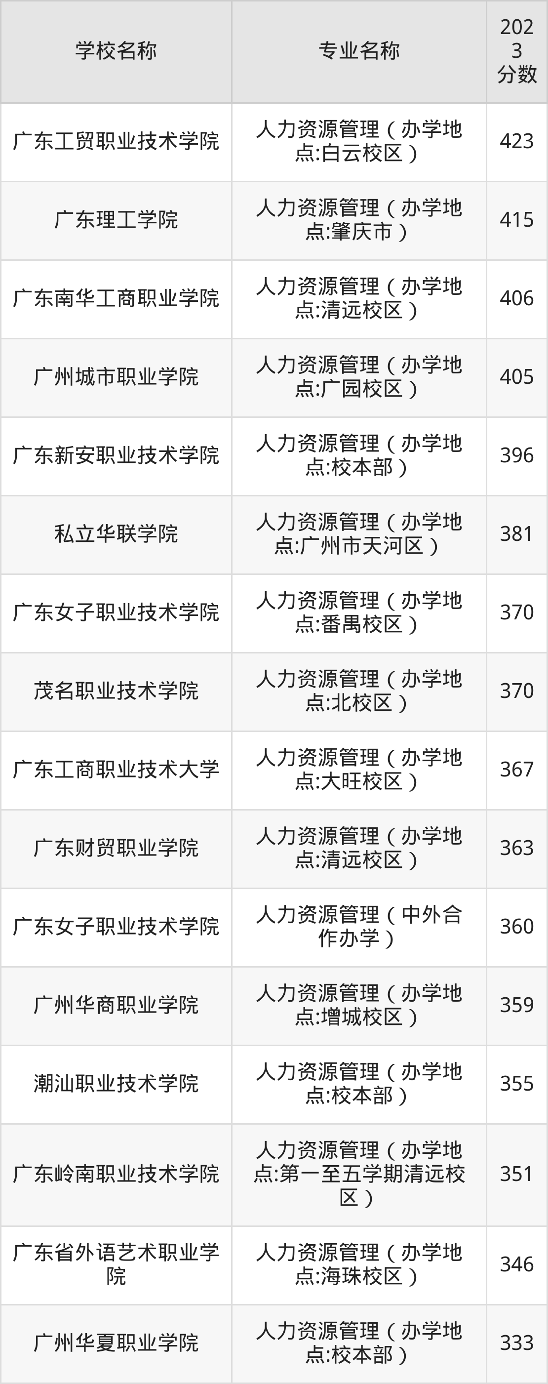 | 广州涉外经济职业技术 学院 | 人力资源管理( 办学地点:校本 部) | 337 |