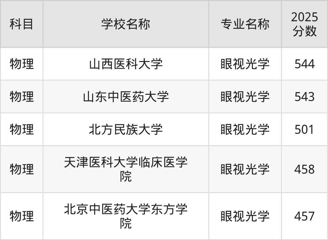 通过上文大家可以知晓,在辽宁省内招眼视光学专业的院校数量较少,所以下文将为2026届高考生继续展示:省外大学的眼视光学专业2025年在辽宁高考的录取情况,包含山西医科大学、山东中医药大学、北方民族大学、天津医科大学临床医学院、北京中医药大学东方学院。