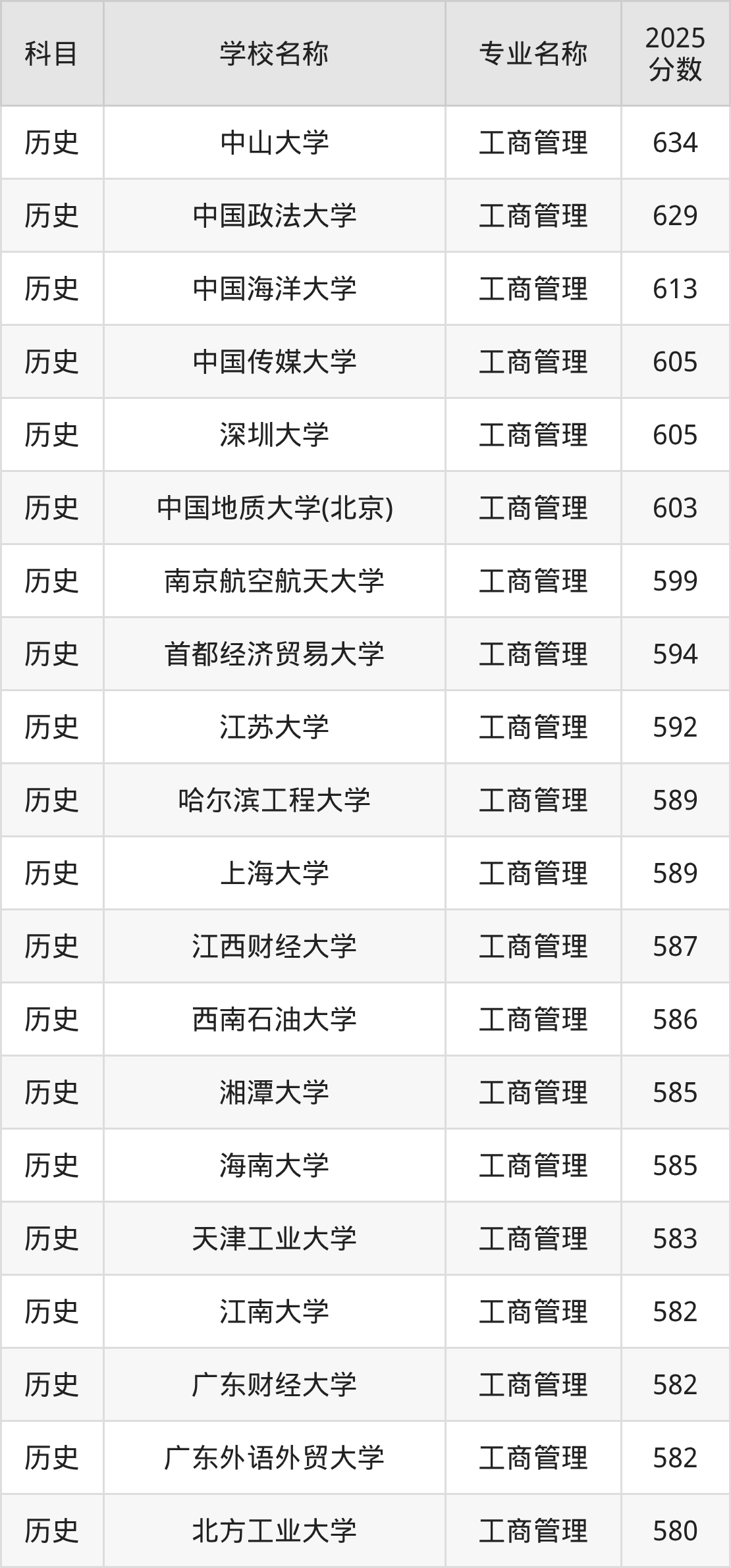 通过上文大家可以知晓,在山西省内招工商管理专业的院校数量较少,所以下文将为2026届高考生继续展示:省外大学的工商管理专业2025年在山西高考的录取情况,包含中山大学、中国政法大学、中国海洋大学、中国传媒大学、深圳大学。