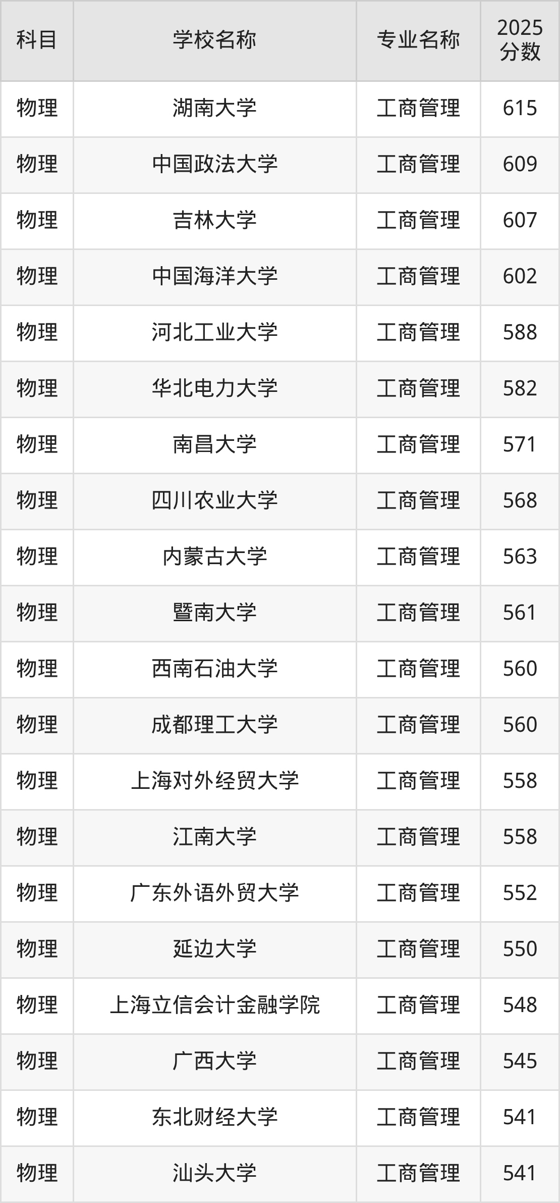 在直接以“工商管理”的名称招生的山西省大学中,山西大学的分数线最高、排名第一名,在物理组的最低分是531分,全省排名前40170位的高考生才有较大机会被录取。