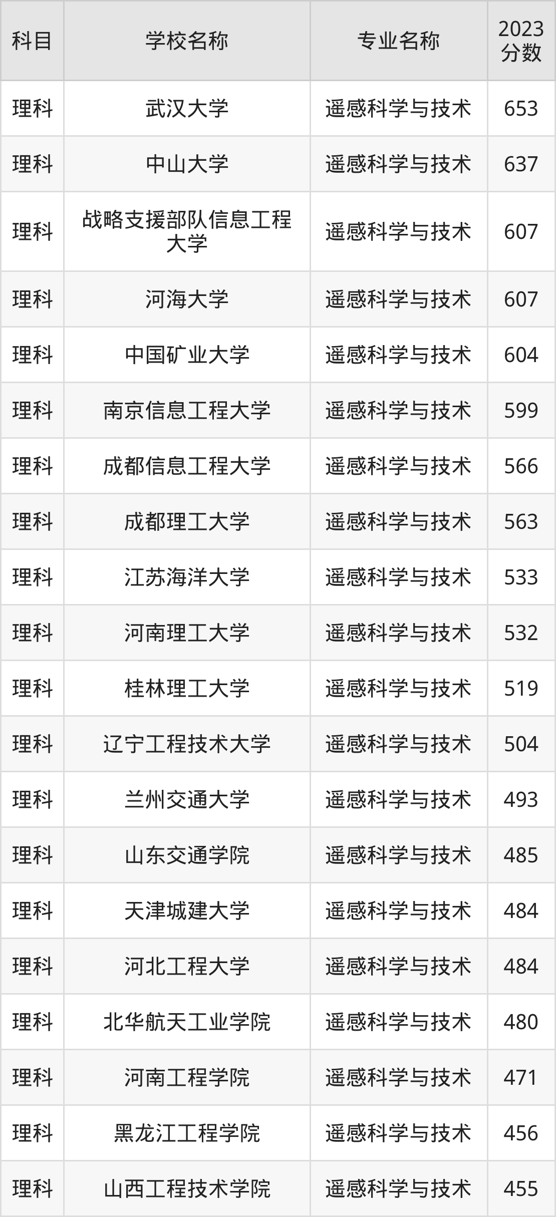 通过上文大家可以知晓,在安徽省内招遥感科学与技术专业的院校数量较少,所以下文将为2025届高考生继续展示:省外大学的遥感科学与技术专业2023年在安徽高考的录取情况,包含武汉大学、中山大学、战略支援部队信息工程大学、河海大学、中国矿业大学。