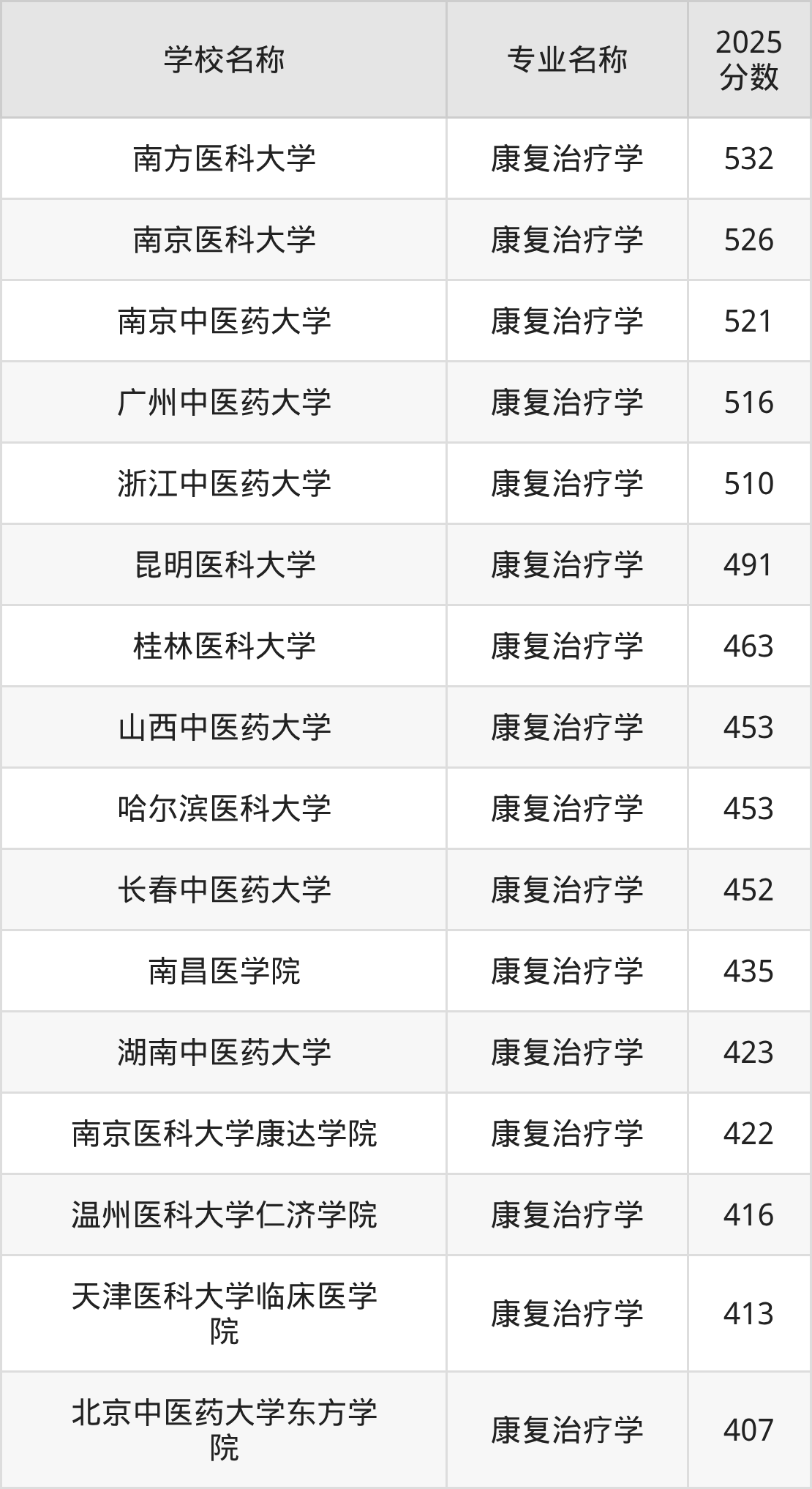 通过上文大家可以知晓,在上海市内招康复治疗学专业的院校数量较少,所以下文将为2026届高考生继续展示:市外大学的康复治疗学专业2025年在上海高考的录取情况,包含南方医科大学、南京医科大学、南京中医药大学、广州中医药大学、浙江中医药大学。