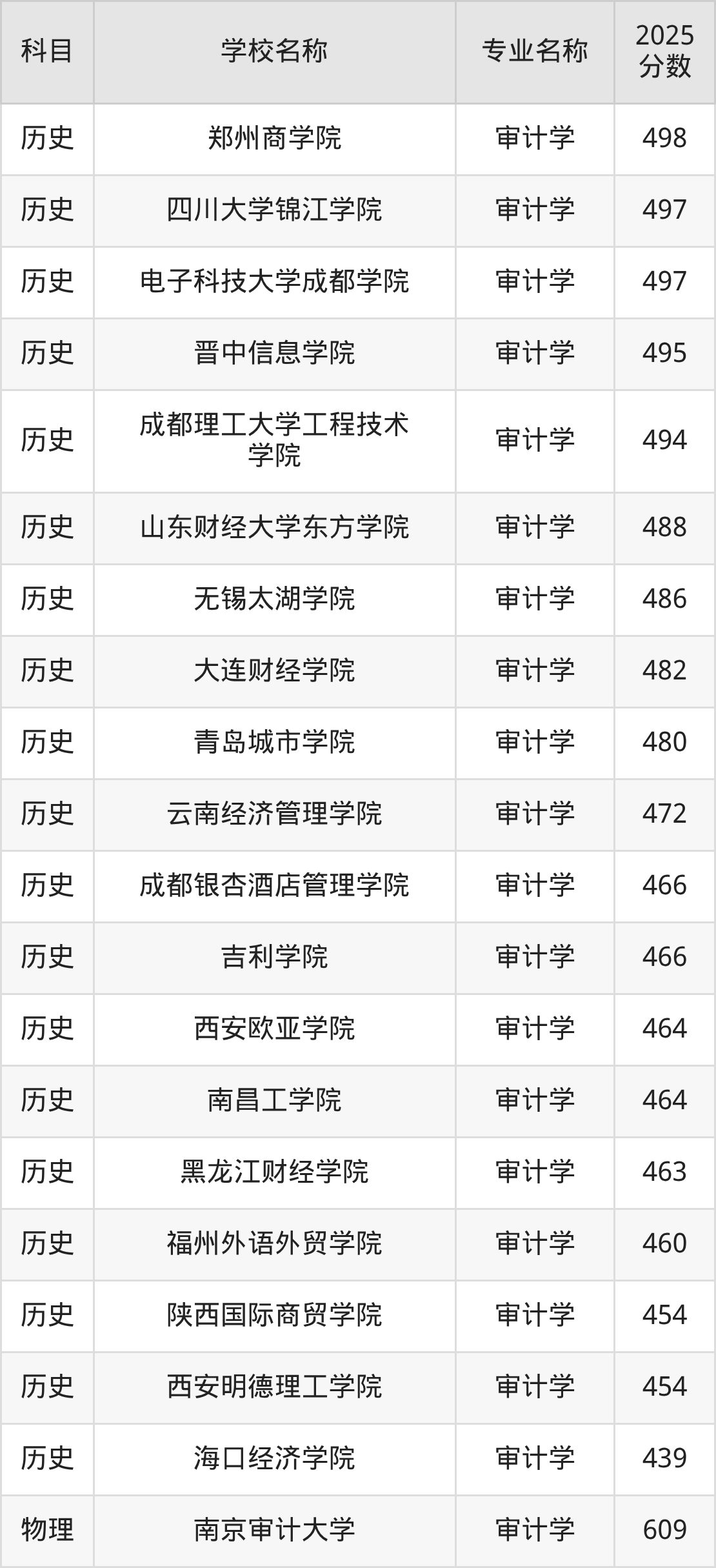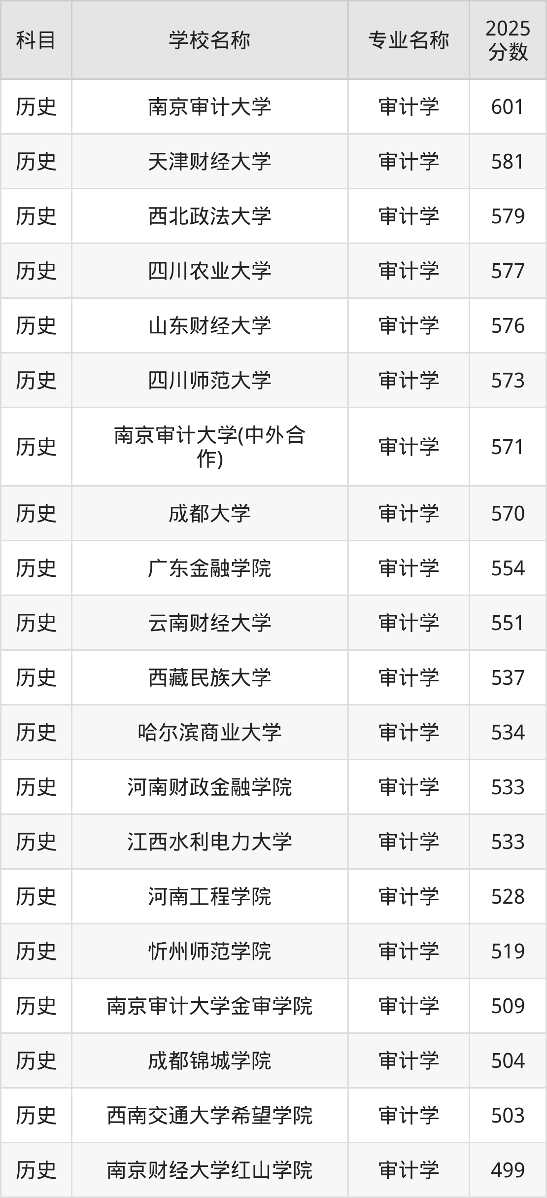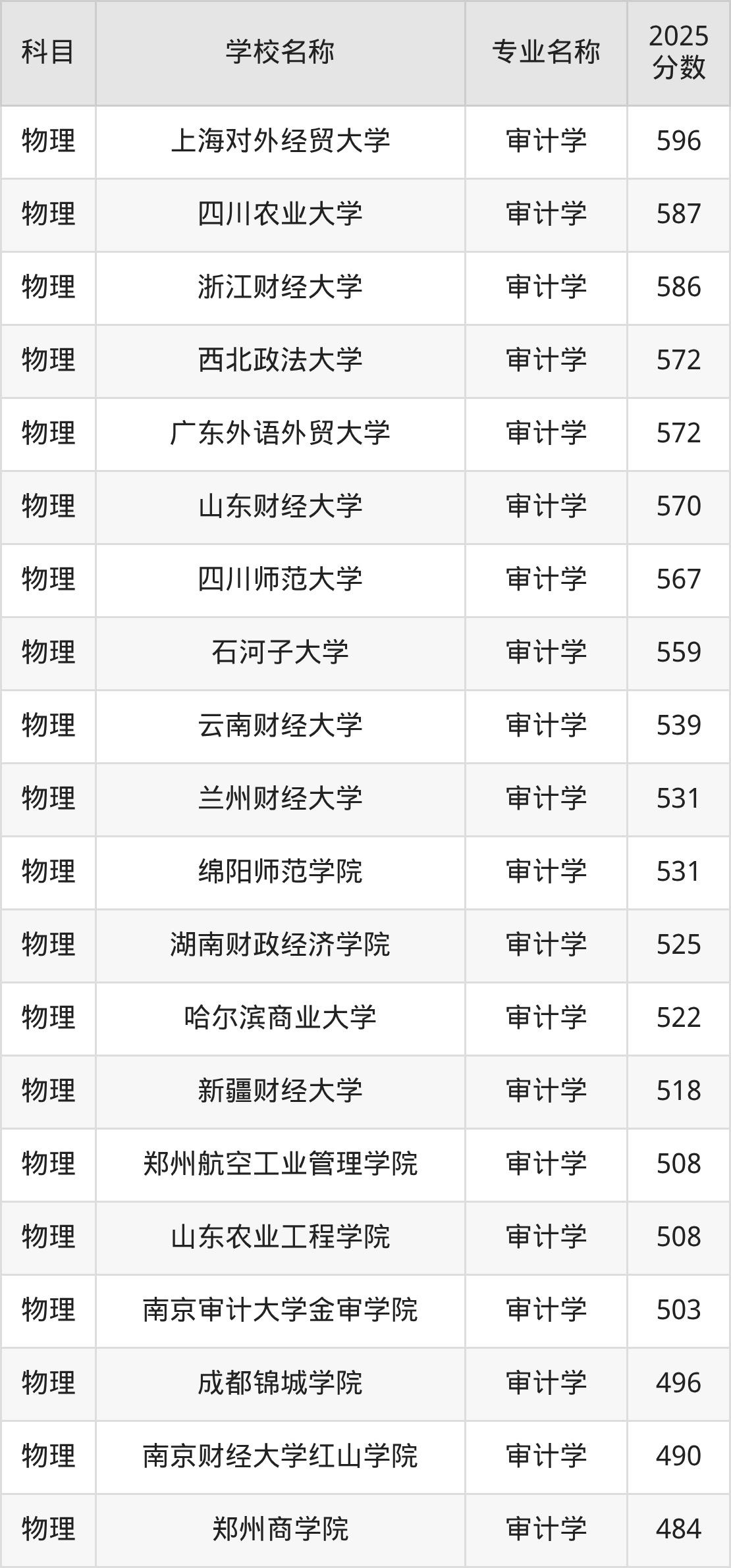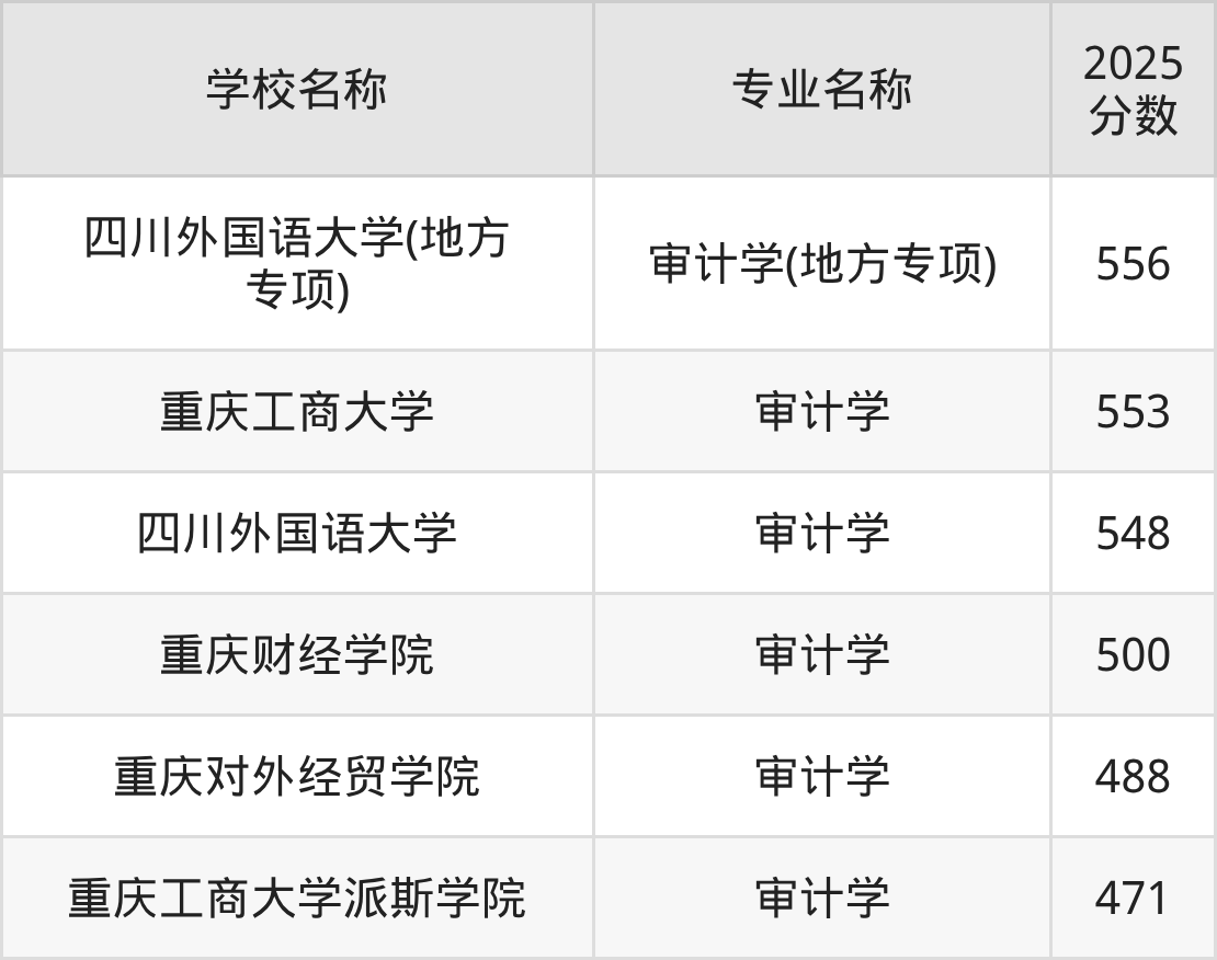 通过上文大家可以知晓,在重庆市内招审计学专业的院校数量较少,所以下文将为2026届高考生继续展示:市外大学的审计学专业2025年在重庆高考的录取情况,包含南京审计大学、天津财经大学、西北政法大学、四川农业大学、山东财经大学。
