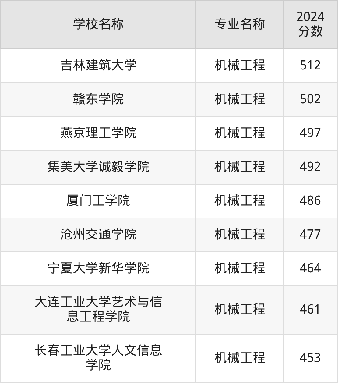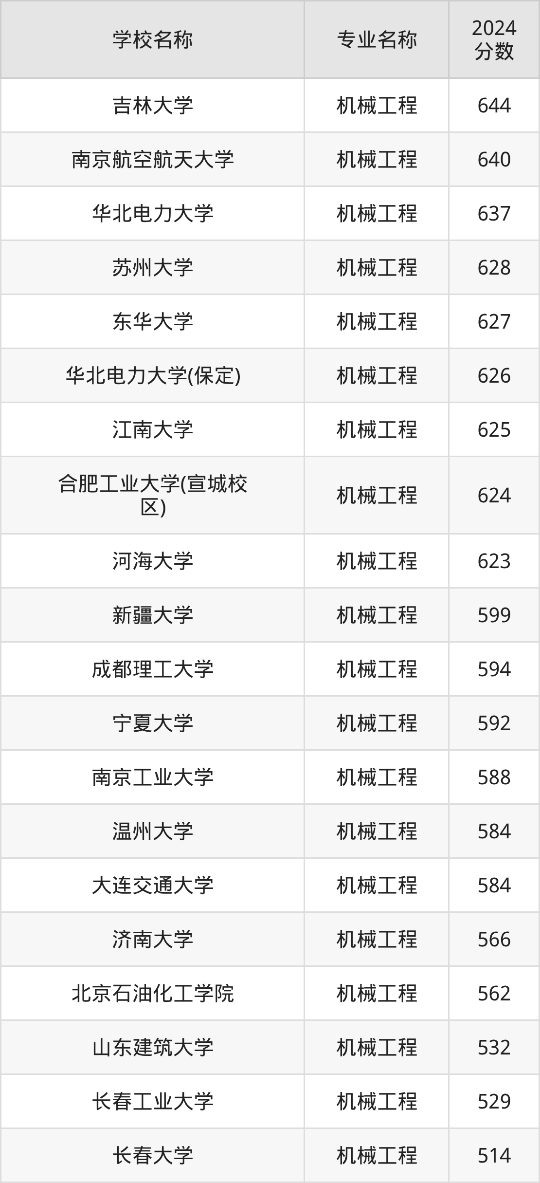 通过上文大家可以知晓,在天津市内招机械工程专业的院校数量较少,所以下文将为2026届高考生继续展示:市外大学的机械工程专业2024年在天津高考的录取情况,包含吉林大学、南京航空航天大学、华北电力大学、苏州大学、东华大学。