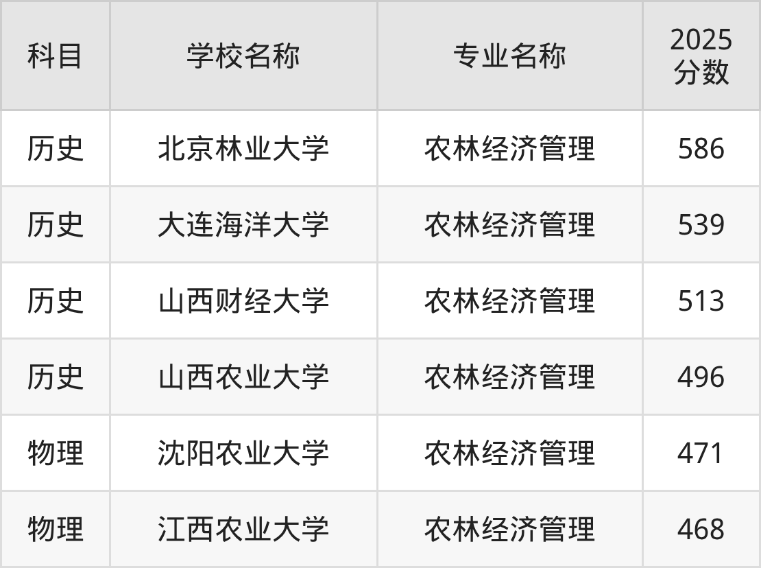 通过上文大家可以知晓,在吉林省内招农林经济管理专业的院校数量较少,所以下文将为2026届高考生继续展示:省外大学的农林经济管理专业2025年在吉林高考的录取情况,包含北京林业大学、大连海洋大学、山西财经大学、山西农业大学、沈阳农业大学。
