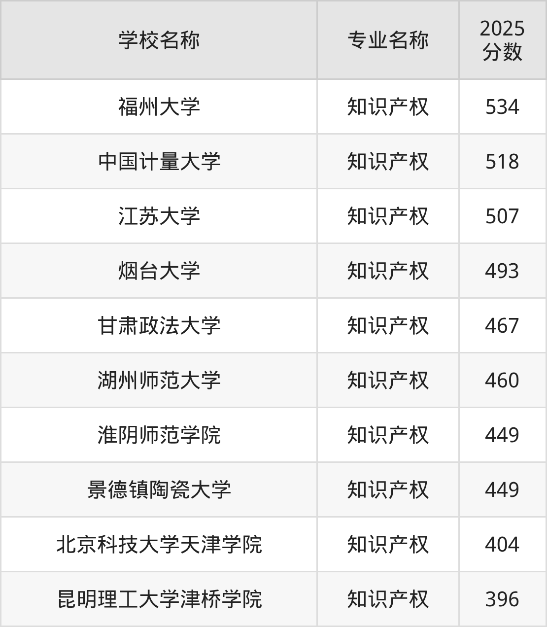 通过上文大家可以知晓,在上海市内招知识产权专业的院校数量较少,所以下文将为2026届高考生继续展示:市外大学的知识产权专业2025年在上海高考的录取情况,包含福州大学、中国计量大学、江苏大学、烟台大学、甘肃政法大学。