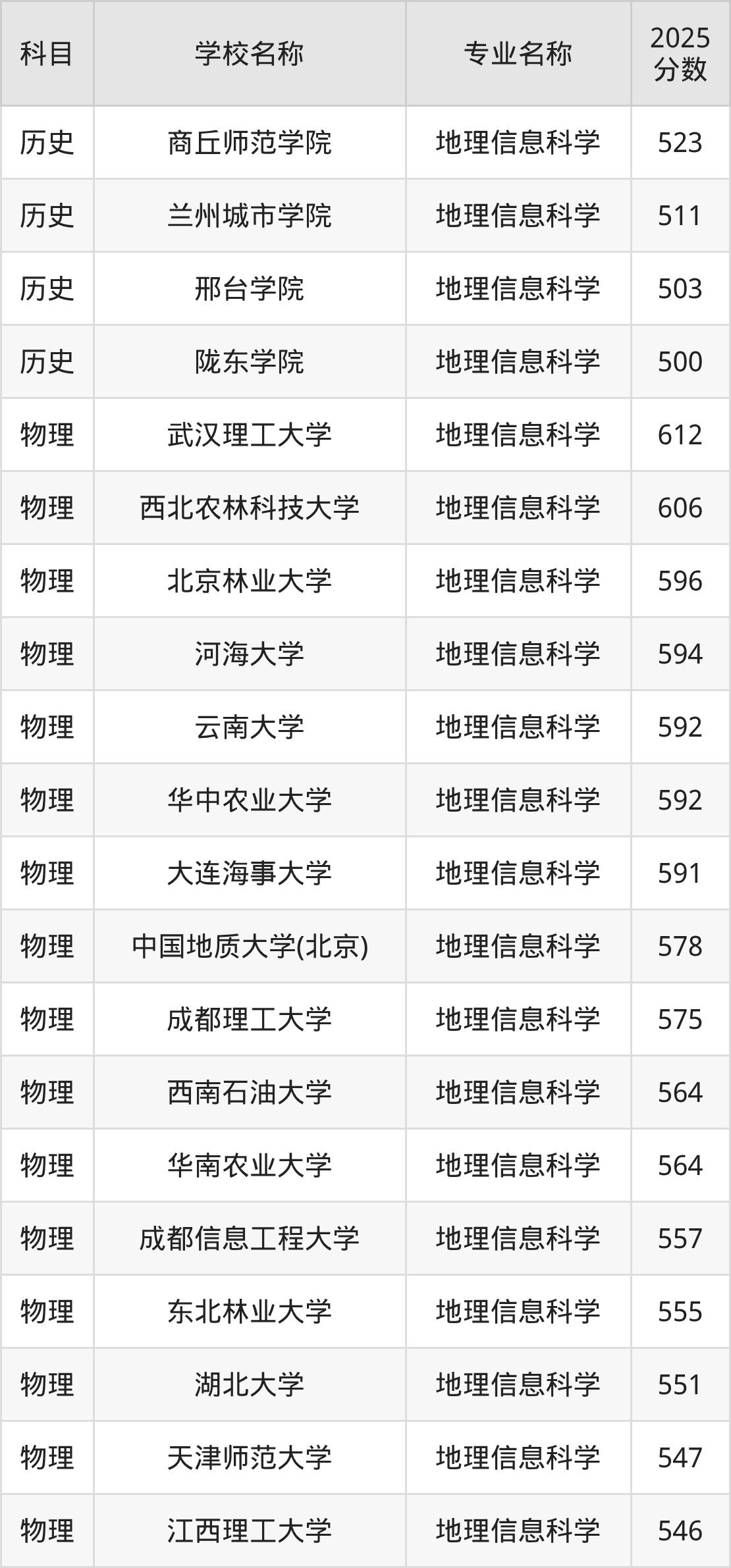 通过上文大家可以知晓,在山西省内招地理信息科学专业的院校数量较少,所以下文将为2026届高考生继续展示:省外大学的地理信息科学专业2025年在山西高考的录取情况,包含商丘师范学院、兰州城市学院、邢台学院、陇东学院、武汉理工大学。