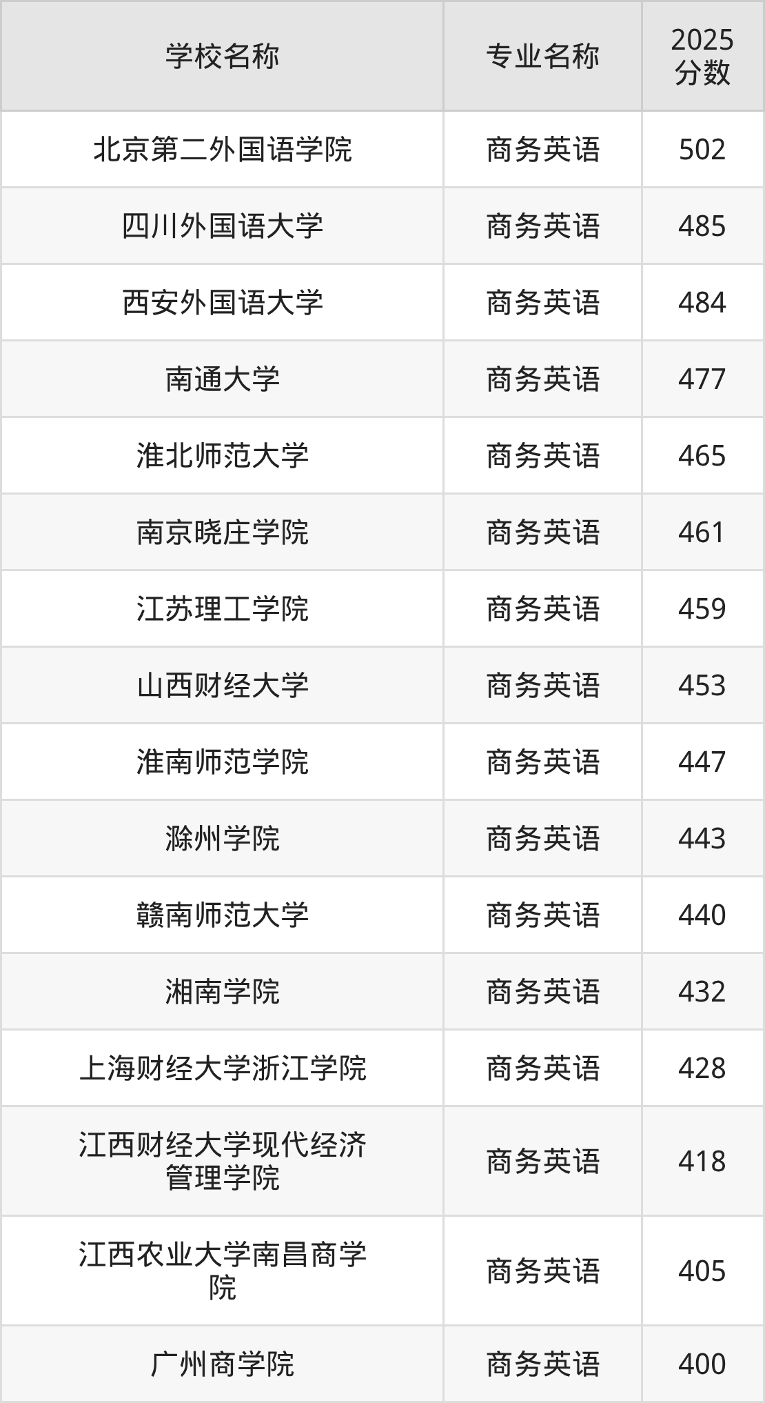 通过上文大家可以知晓,在上海市内招商务英语专业的院校数量较少,所以下文将为2026届高考生继续展示:市外大学的商务英语专业2025年在上海高考的录取情况,包含北京第二外国语学院、四川外国语大学、西安外国语大学、南通大学、淮北师范大学。