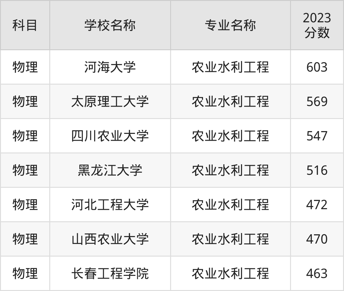 通过上文大家可以知晓,在辽宁省内招农业水利工程专业的院校数量较少,所以下文将为2025届高考生继续展示:省外大学的农业水利工程专业2023年在辽宁高考的录取情况,包含河海大学、太原理工大学、四川农业大学、黑龙江大学、河北工程大学。