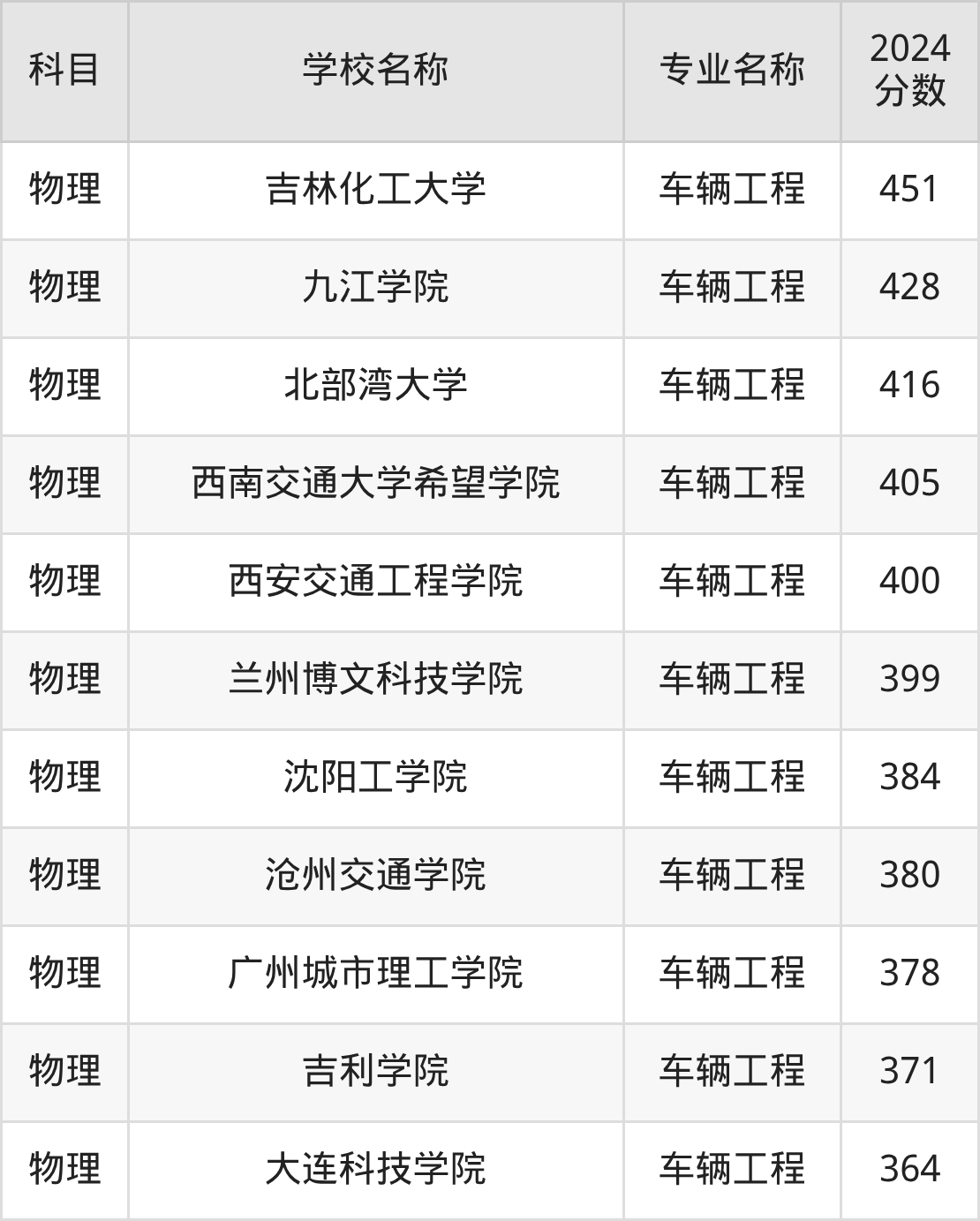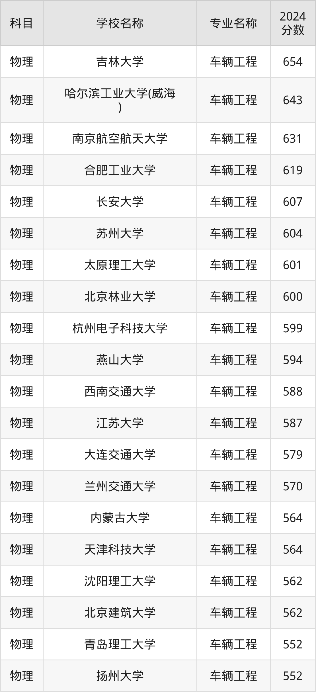 通过上文大家可以知晓,在黑龙江省内招车辆工程专业的院校数量较少,所以下文将为2026届高考生继续展示:省外大学的车辆工程专业2024年在黑龙江高考的录取情况,包含吉林大学、哈尔滨工业大学(威海)、南京航空航天大学、合肥工业大学、长安大学。