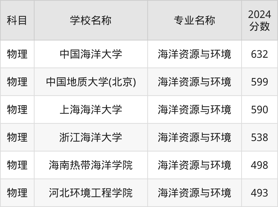 在直接以“海洋资源与环境”的名称招生的江苏省大学中,南京师范大学的分数线最高、排名第一名,在物理组的最低分是602分,全省排名前28486位的高考生才有较大机会被录取。