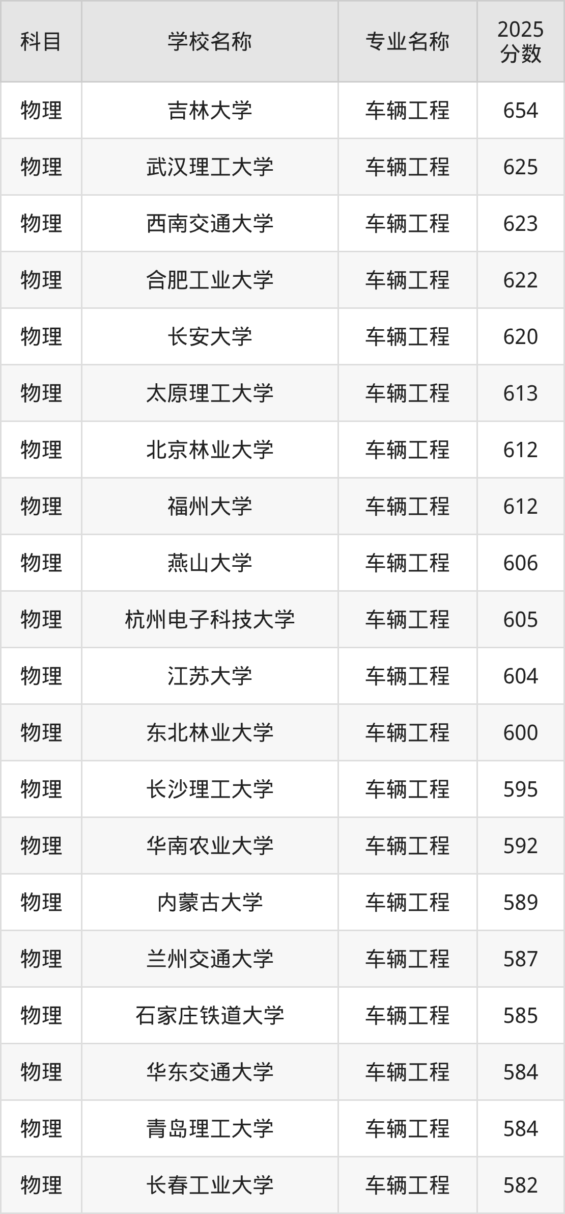 通过上文大家可以知晓,在辽宁省内招车辆工程专业的院校数量较少,所以下文将为2026届高考生继续展示:省外大学的车辆工程专业2025年在辽宁高考的录取情况,包含吉林大学、武汉理工大学、西南交通大学、合肥工业大学、长安大学。