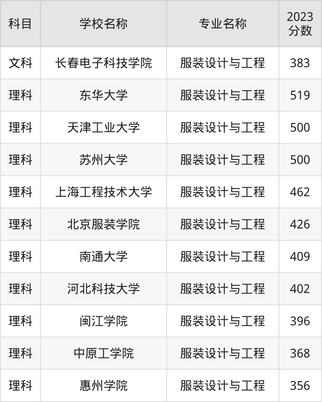 通过上文大家可以知晓,在内蒙古自治区内招服装设计与工程专业的院校数量较少,所以下文将为2025届高考生继续展示:自治区外大学的服装设计与工程专业2023年在内蒙古高考的录取情况,包含长春电子科技学院、东华大学、天津工业大学、苏州大学、上海工程技术大学。