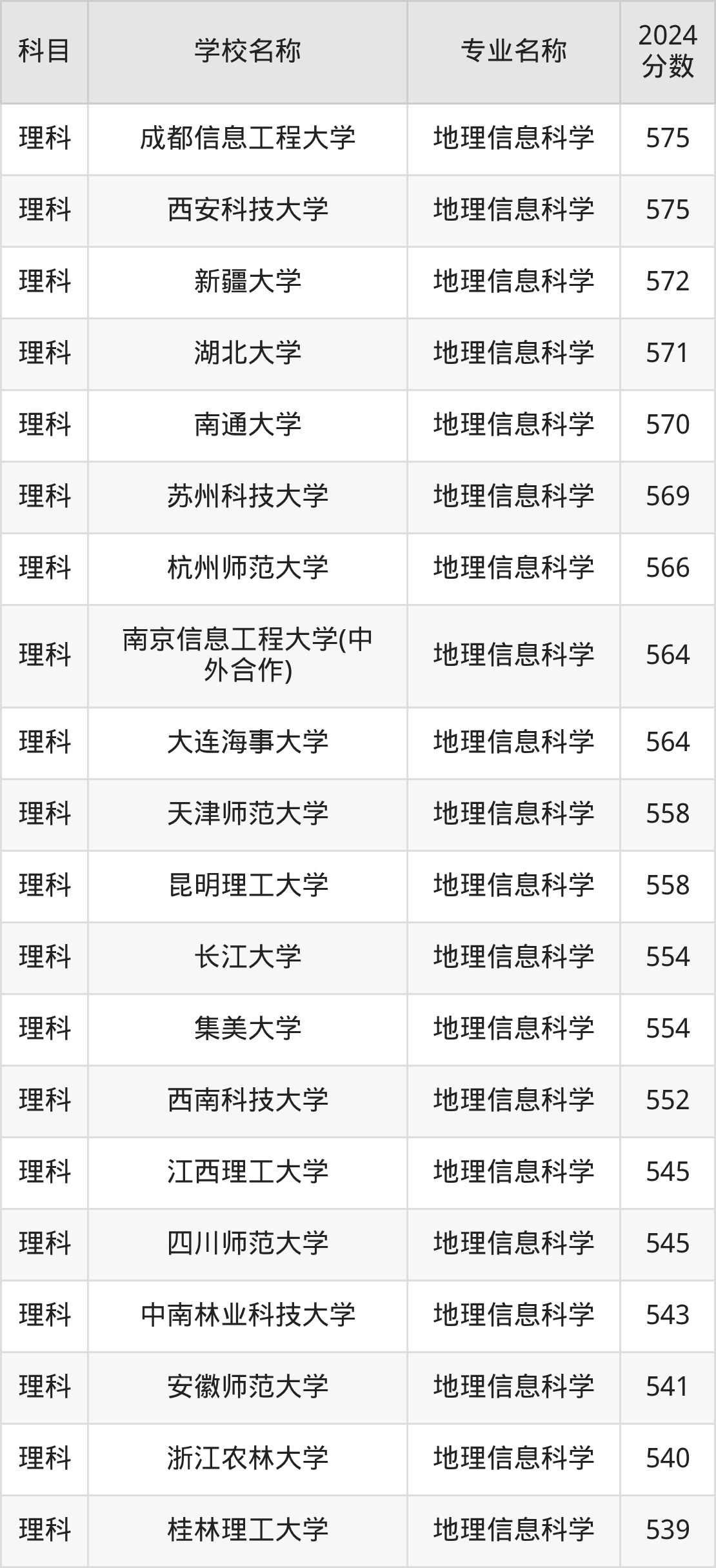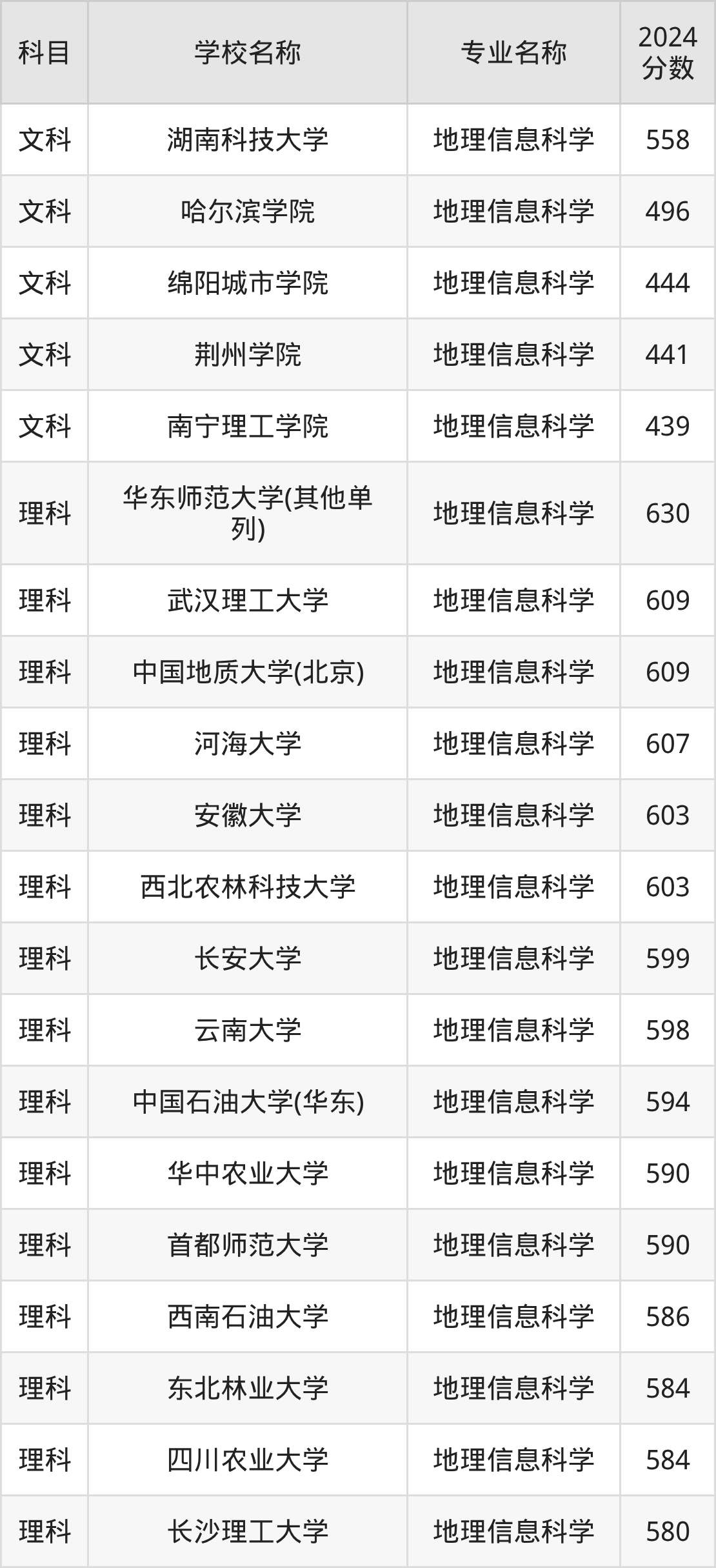 通过上文大家可以知晓,在河南省内招地理信息科学专业的院校数量较少,所以下文将为2026届高考生继续展示:省外大学的地理信息科学专业2024年在河南高考的录取情况,包含湖南科技大学、哈尔滨学院、绵阳城市学院、荆州学院、南宁理工学院。