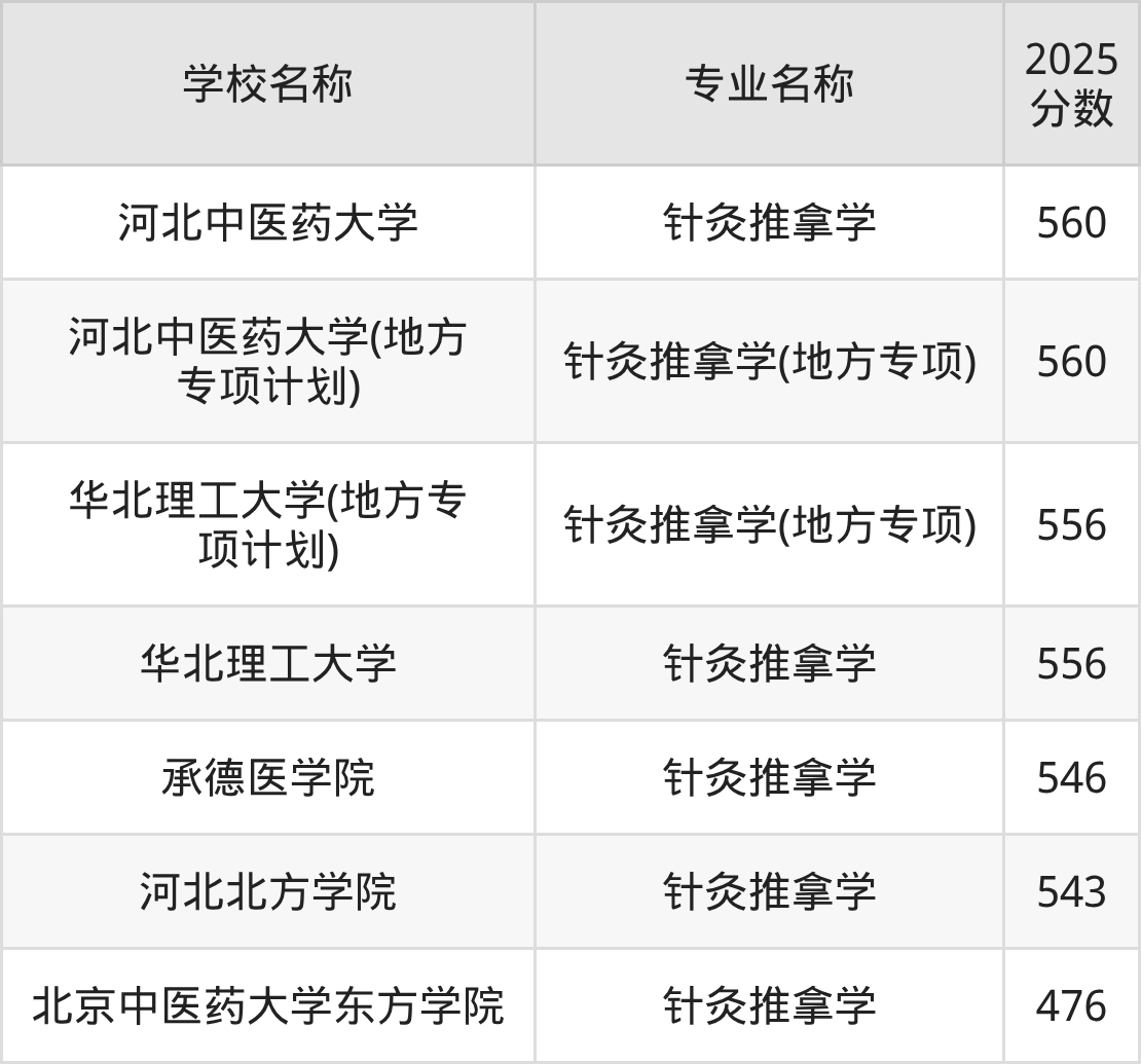 下文将为大家展示河北省大学针灸推拿学专业2025年在河北高考的最低录取分数线!