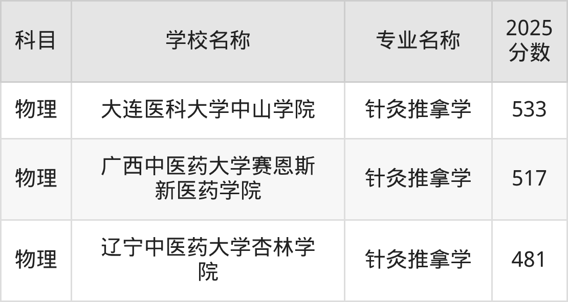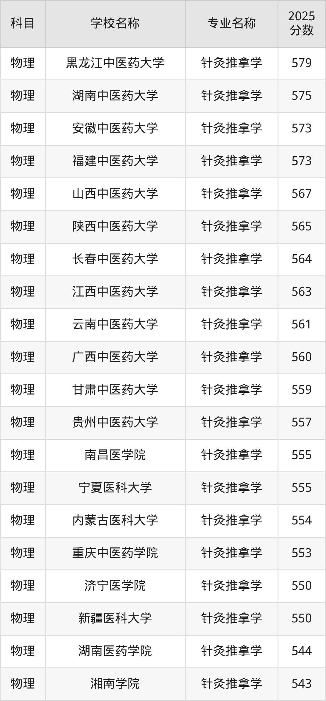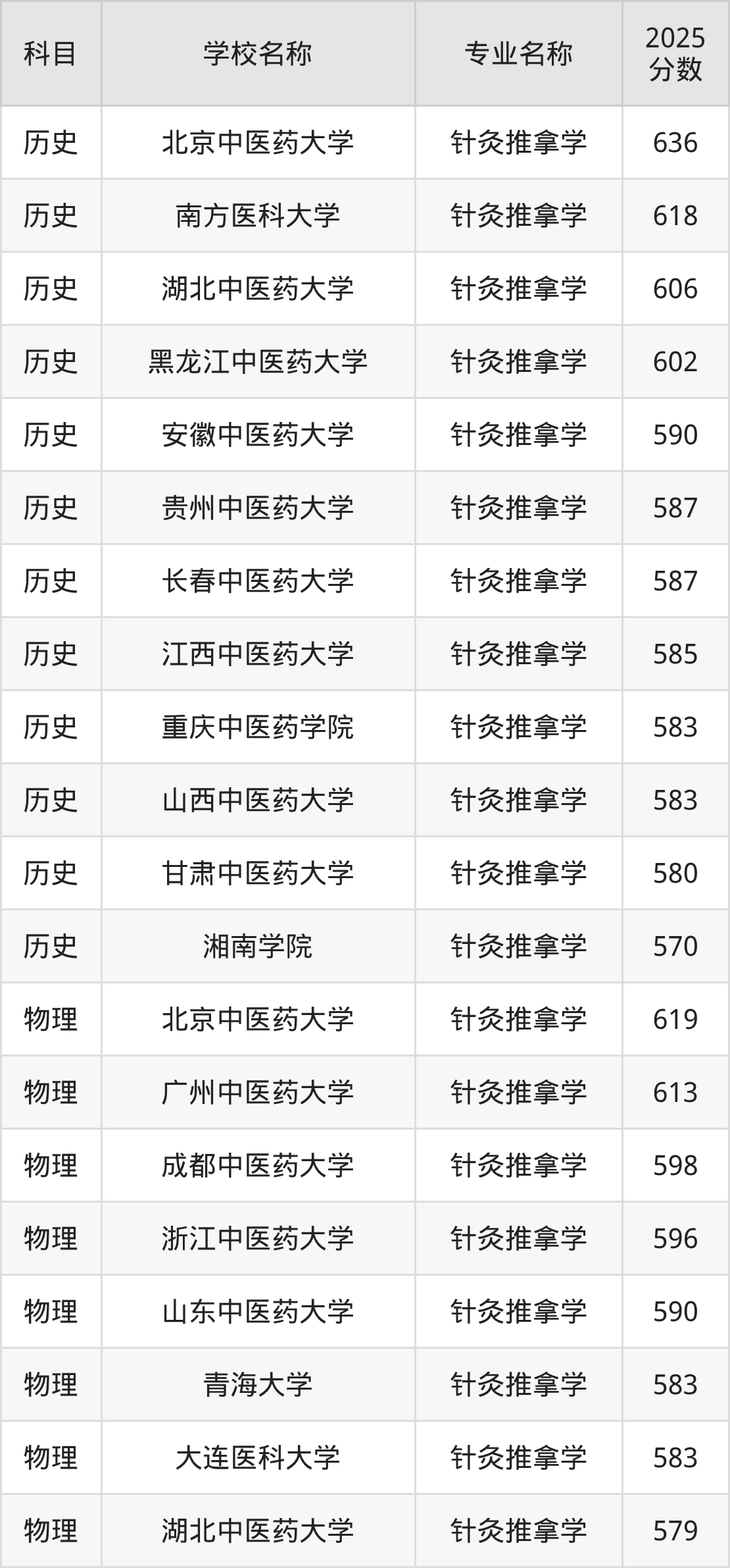 通过上文大家可以知晓,在河北省内招针灸推拿学专业的院校数量较少,所以下文将为2026届高考生继续展示:省外大学的针灸推拿学专业2025年在河北高考的录取情况,包含北京中医药大学、南方医科大学、湖北中医药大学、黑龙江中医药大学、安徽中医药大学。