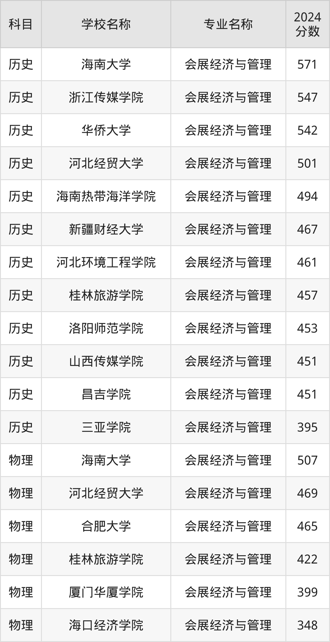 通过上文大家可以知晓,在黑龙江省内招会展经济与管理专业的院校数量较少,所以下文将为2025届高考生继续展示:省外大学的会展经济与管理专业2024年在黑龙江高考的录取情况,包含海南大学、浙江传媒学院、华侨大学、河北经贸大学、海南热带海洋学院。