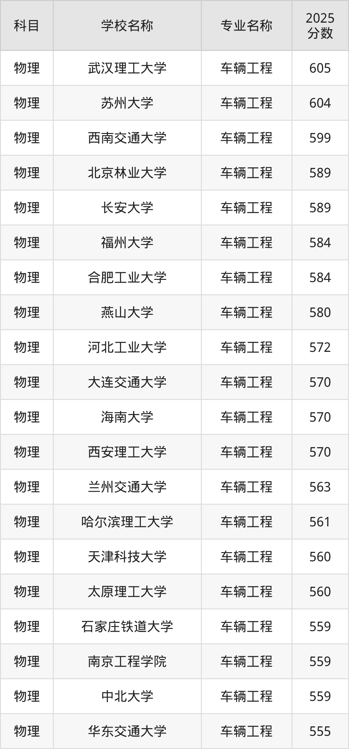 通过上文大家可以知晓,在吉林省内招车辆工程专业的院校数量较少,所以下文将为2026届高考生继续展示:省外大学的车辆工程专业2025年在吉林高考的录取情况,包含武汉理工大学、苏州大学、西南交通大学、北京林业大学、长安大学。