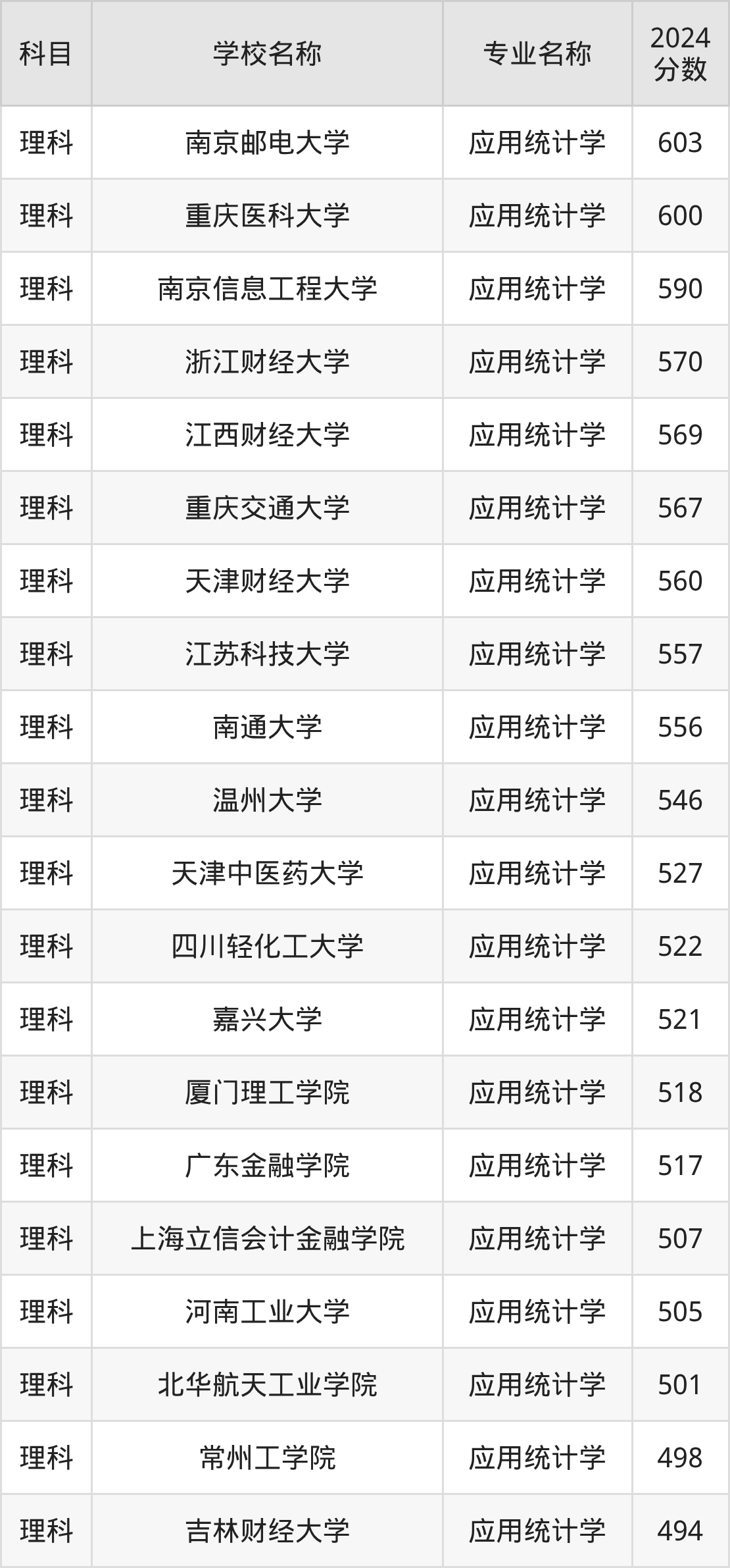 通过上文大家可以知晓,在云南省内招应用统计学专业的院校数量较少,所以下文将为2026届高考生继续展示:省外大学的应用统计学专业2024年在云南高考的录取情况,包含南京邮电大学、重庆医科大学、南京信息工程大学、浙江财经大学、江西财经大学。