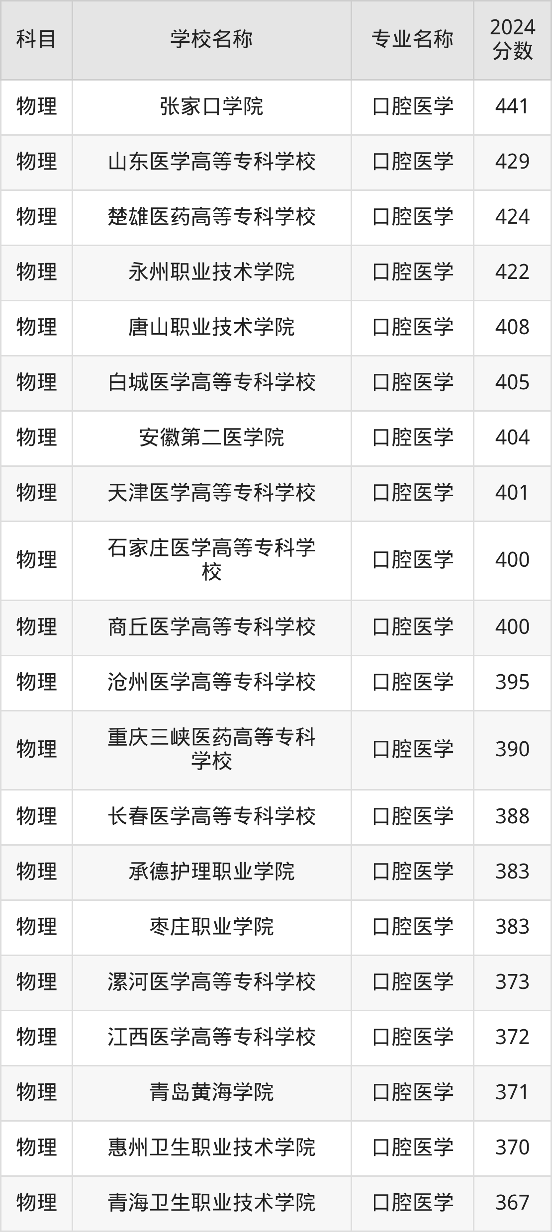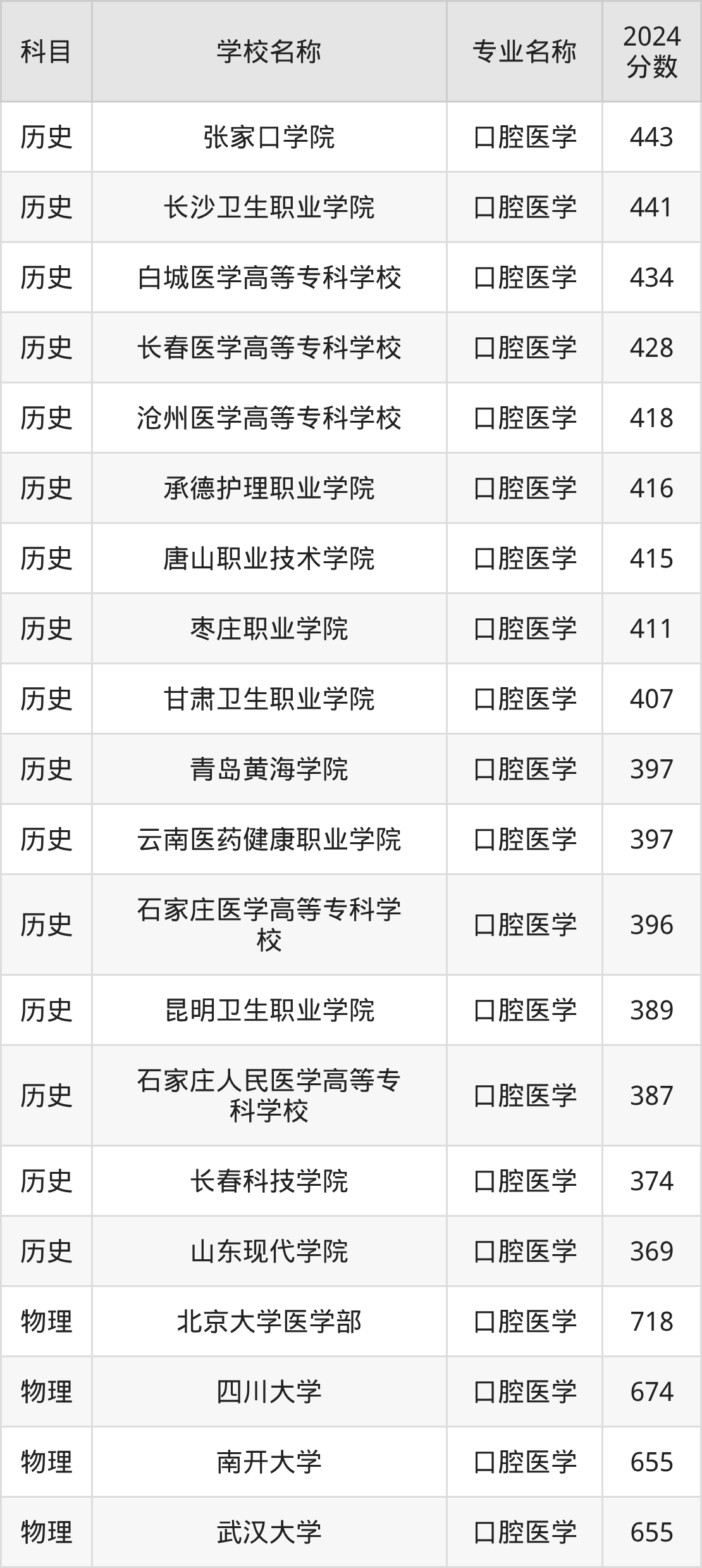 | 大庆医学高等专科学校 | 口腔医学 | 398 |