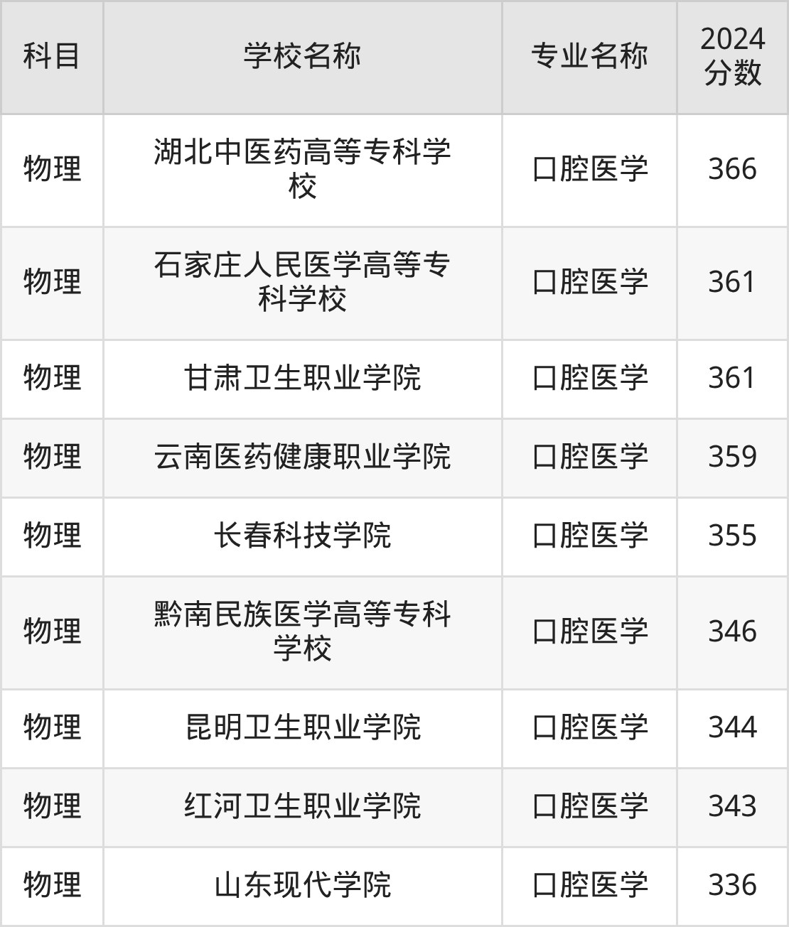 | 伊春职业学院 | 口腔医学 | 353 |