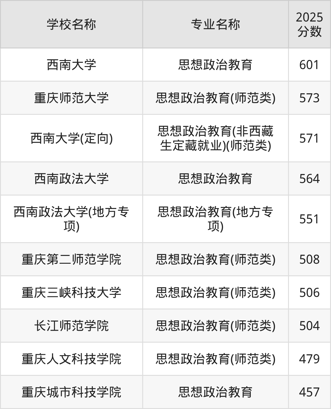 圆梦小编根据重庆2025年高考历史组专业分,将开设了思想政治教育专业且位于重庆市内的大学按照“录取分”从高到低排序,得出了以上榜单。
