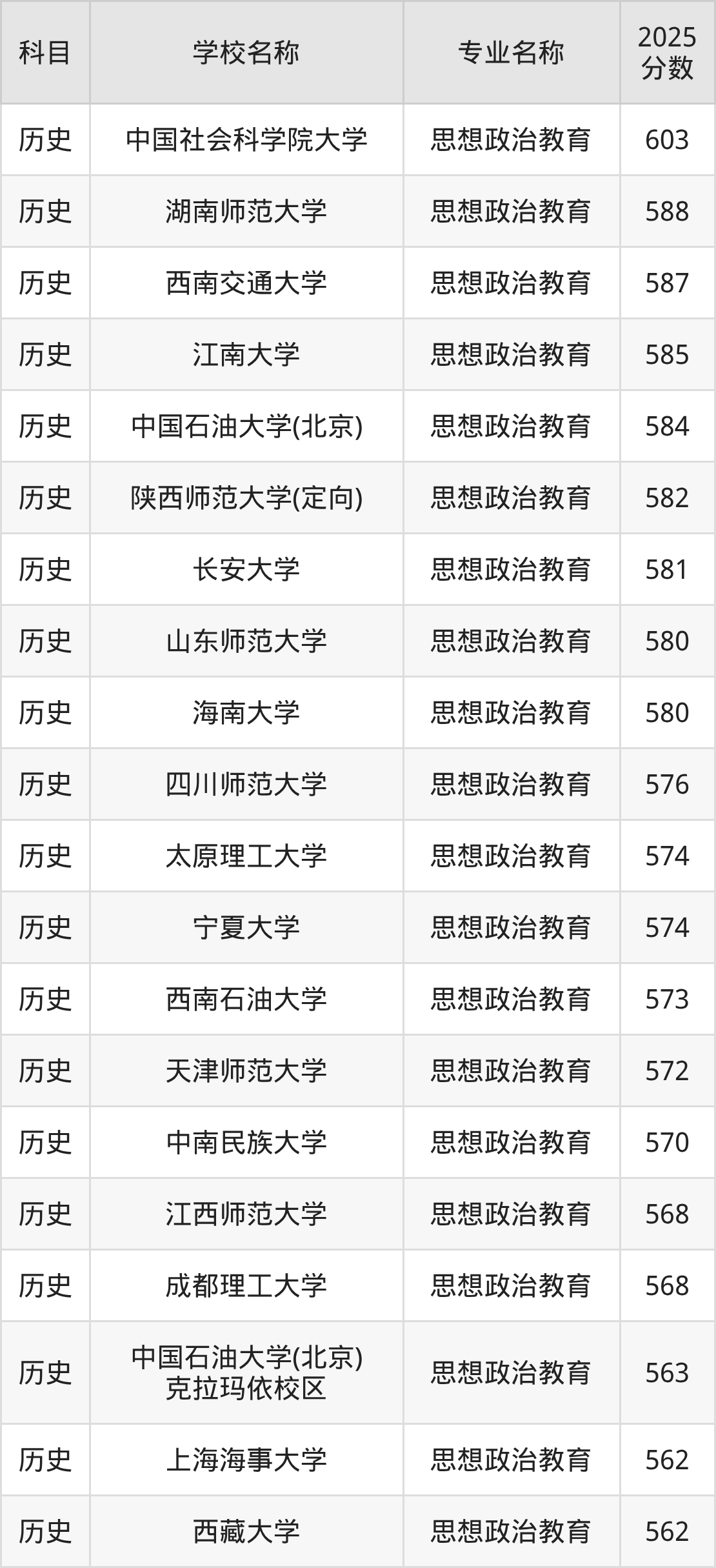 通过上文大家可以知晓,在重庆市内招思想政治教育专业的院校数量较少,所以下文将为2026届高考生继续展示:市外大学的思想政治教育专业2025年在重庆高考的录取情况,包含中国社会科学院大学、湖南师范大学、西南交通大学、江南大学、中国石油大学(北京)。