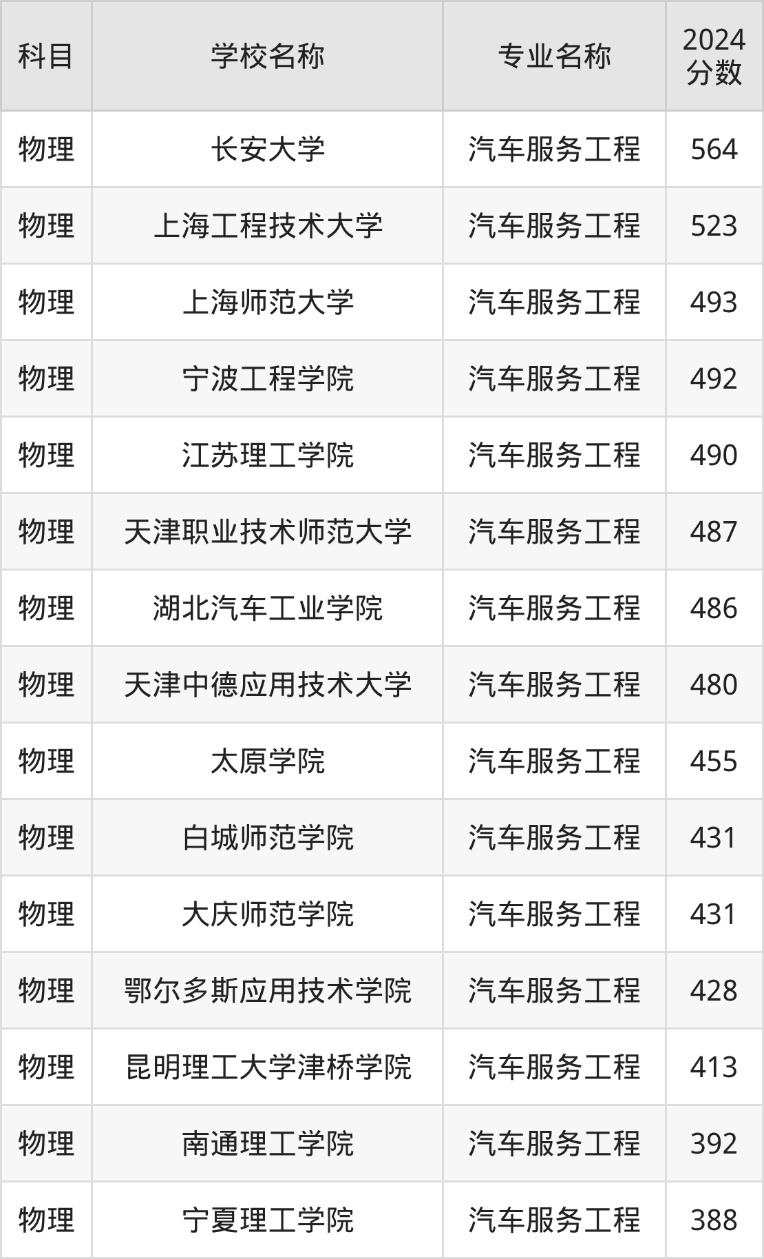 通过上文大家可以知晓,在甘肃省内招汽车服务工程专业的院校数量较少,所以下文将为2026届高考生继续展示:省外大学的汽车服务工程专业2024年在甘肃高考的录取情况,包含长安大学、上海工程技术大学、上海师范大学、宁波工程学院、江苏理工学院。