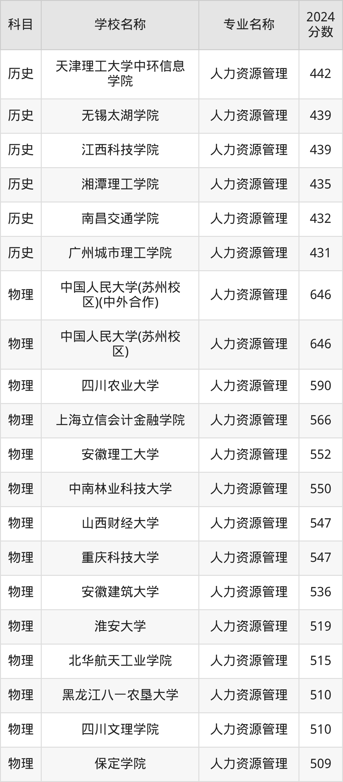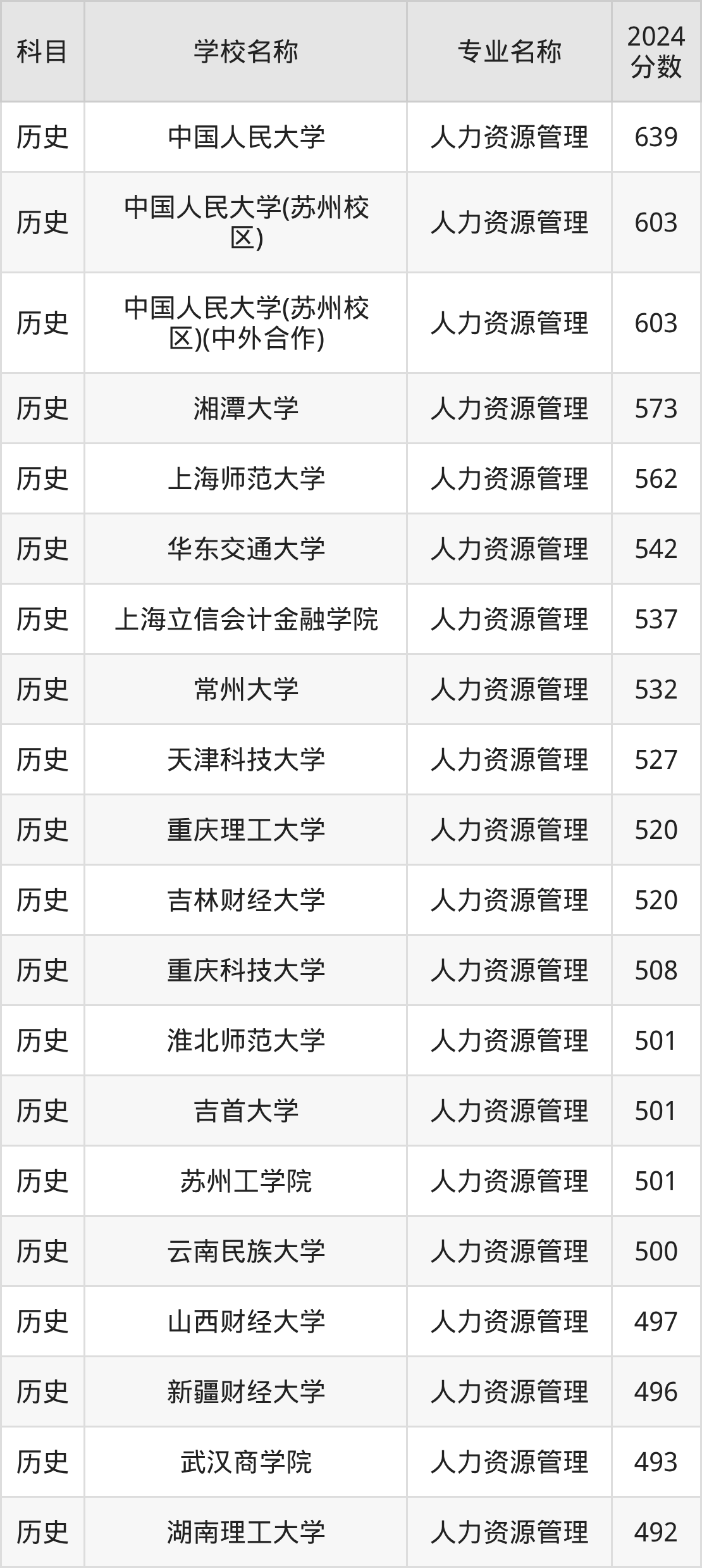 通过上文大家可以知晓,在福建省内招人力资源管理专业的院校数量较少,所以下文将为2026届高考生继续展示:省外大学的人力资源管理专业2024年在福建高考的录取情况,包含中国人民大学、中国人民大学(苏州校区)、中国人民大学(苏州校区)(中外合作)、湘潭大学、上海师范大学。