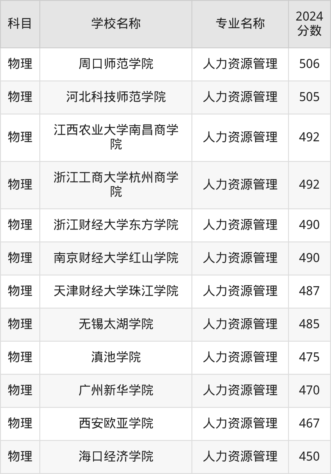 福建高考物理组:人力资源管理专业的最低分是455分~571分