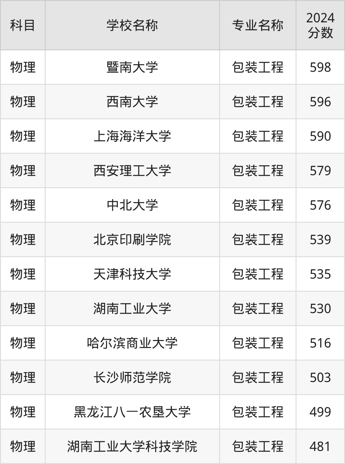 在直接以“包装工程”的名称招生的江苏省大学中,江南大学的分数线最高、排名第一名,在物理组的最低分是608分,全省排名前24206位的高考生才有较大机会被录取。