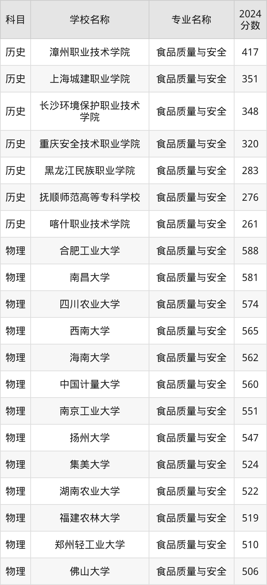 | 广西农业职业技术大学 | 食品质量与安全 | 417 |