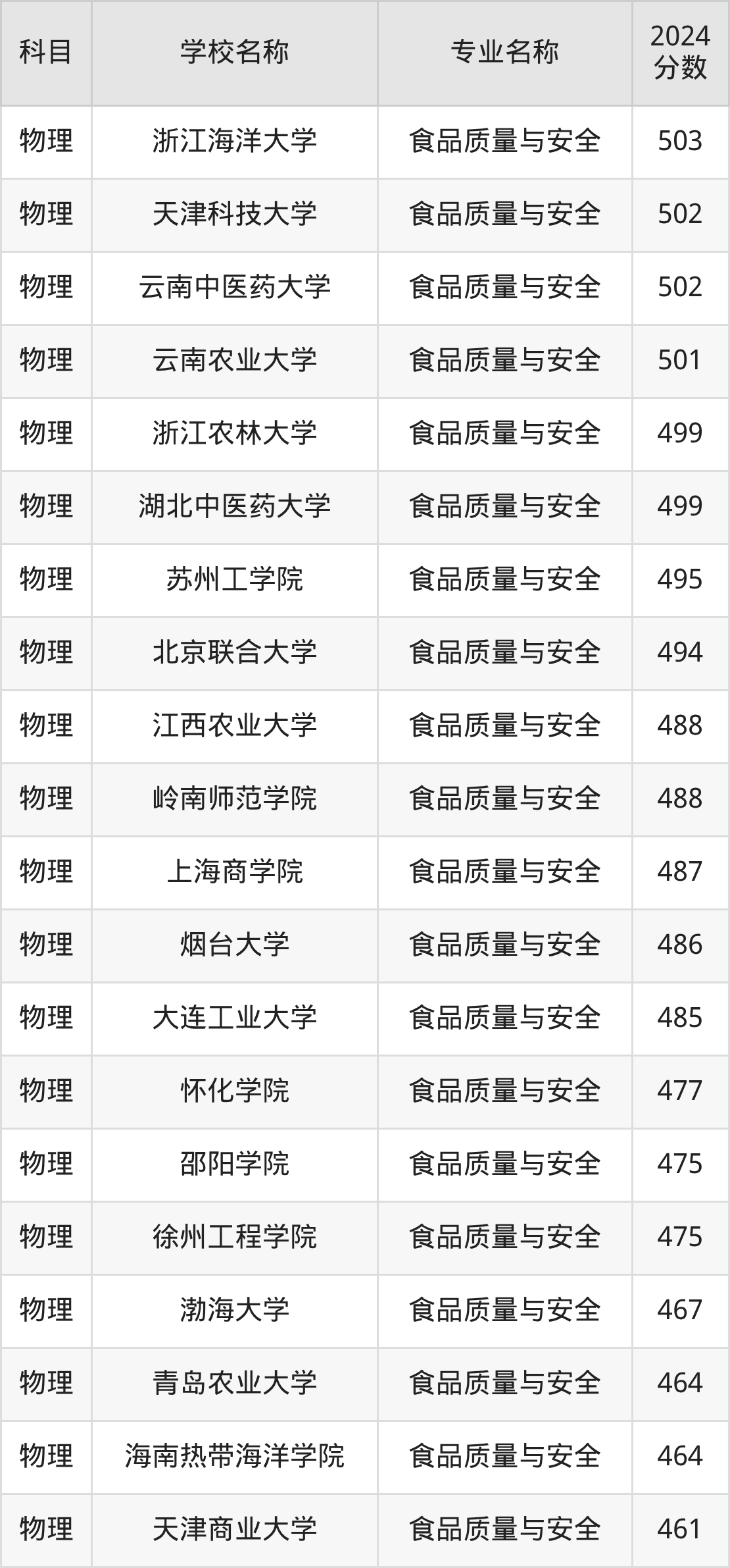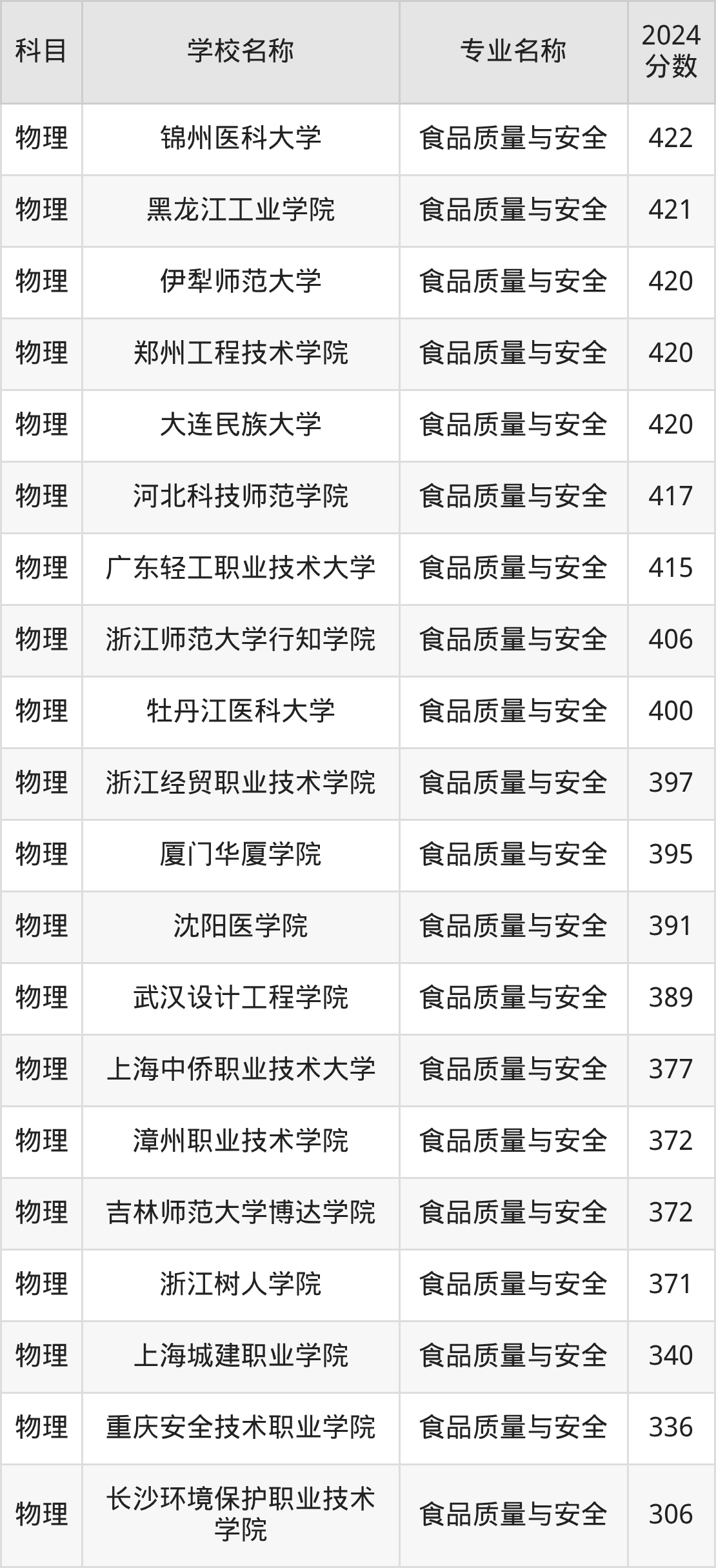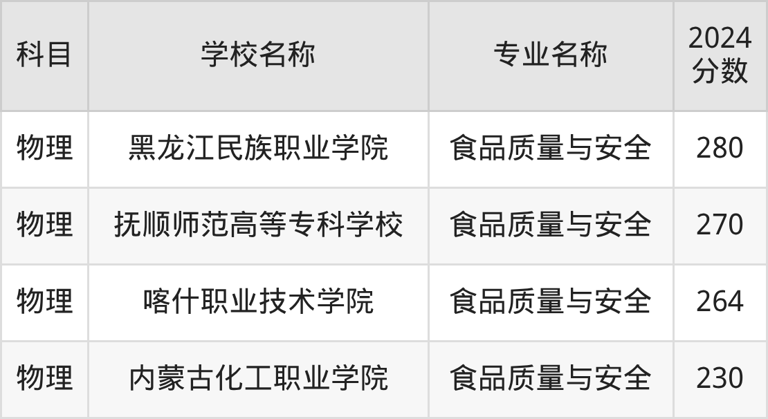 广西高考物理组:食品质量与安全专业的最低分是300分~470分
