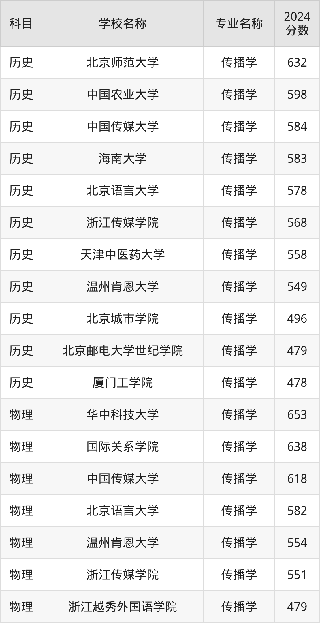 通过上文大家可以知晓,在江苏省内招传播学专业的院校数量较少,所以下文将为2025届高考生继续展示:省外大学的传播学专业2024年在江苏高考的录取情况,包含北京师范大学、中国农业大学、中国传媒大学、海南大学、北京语言大学。