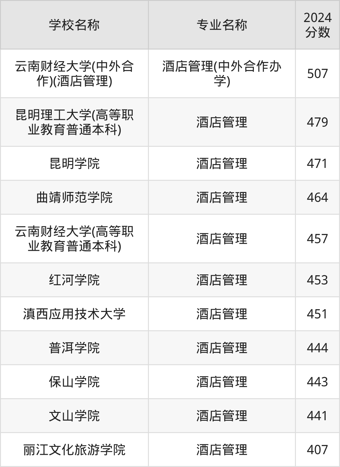 | 昆明理工大学(高等职 业教育普通本科) | 酒店管理 | 524 |