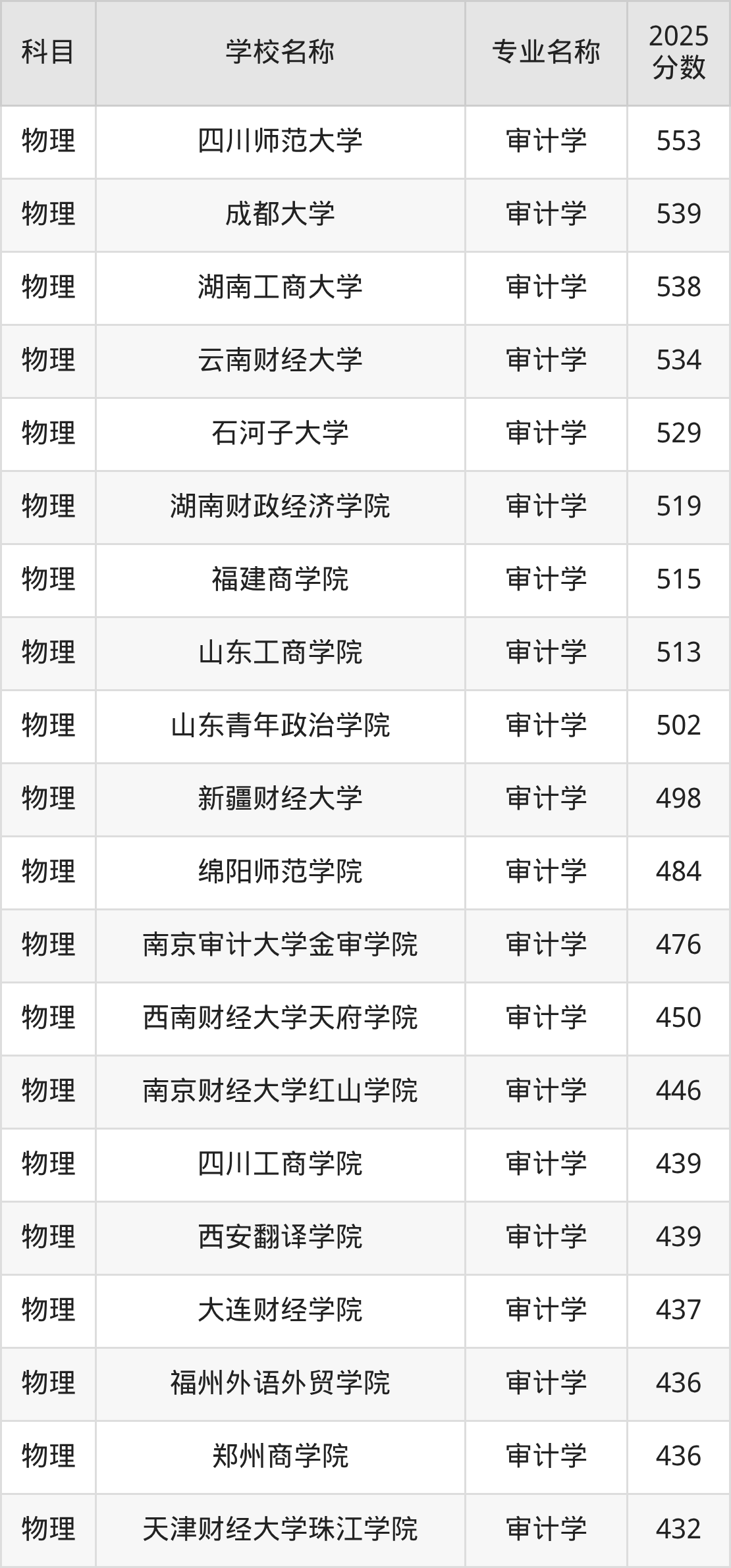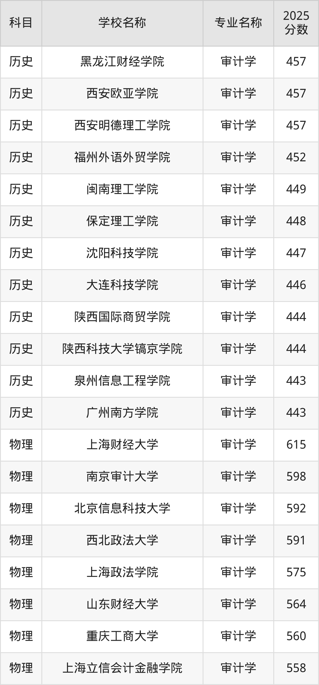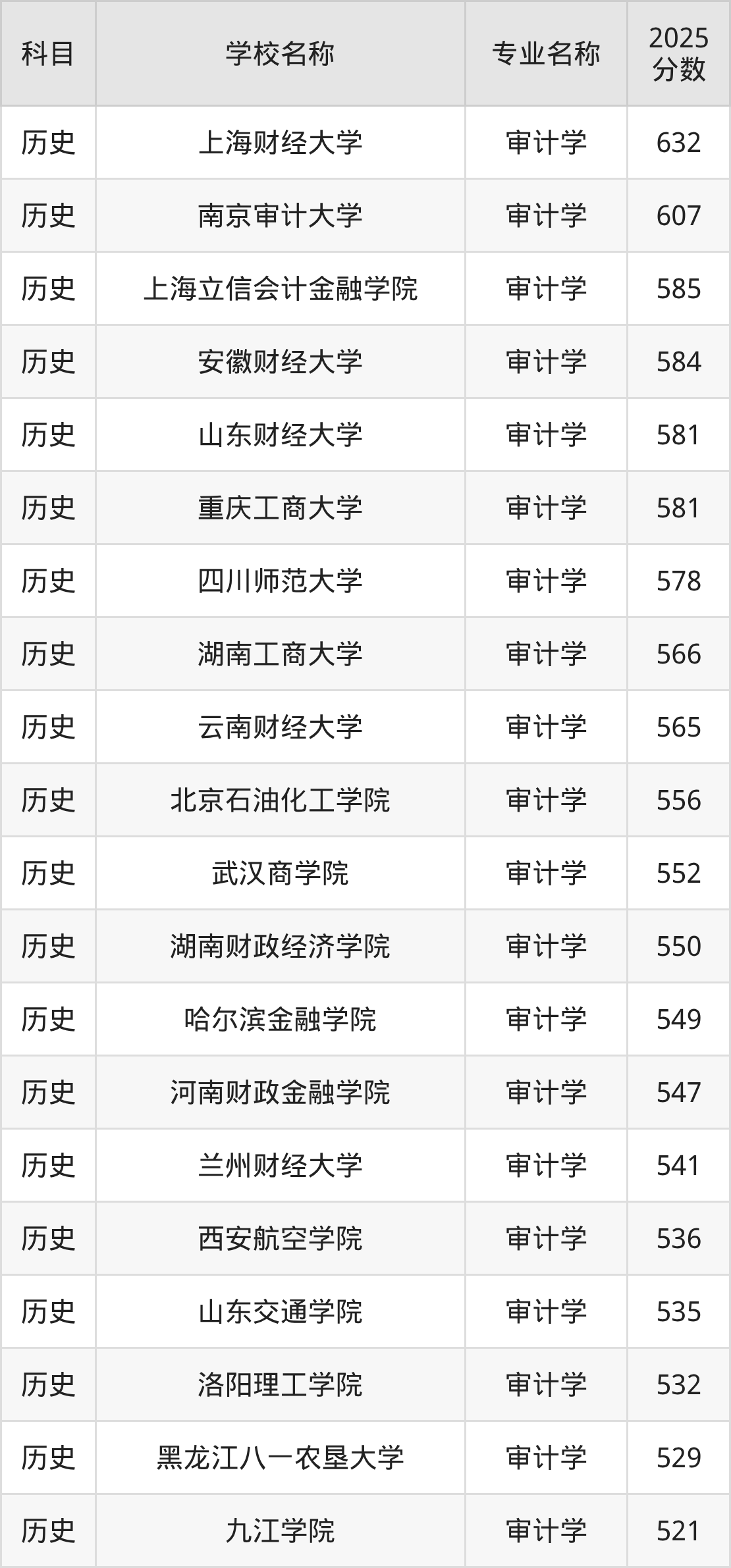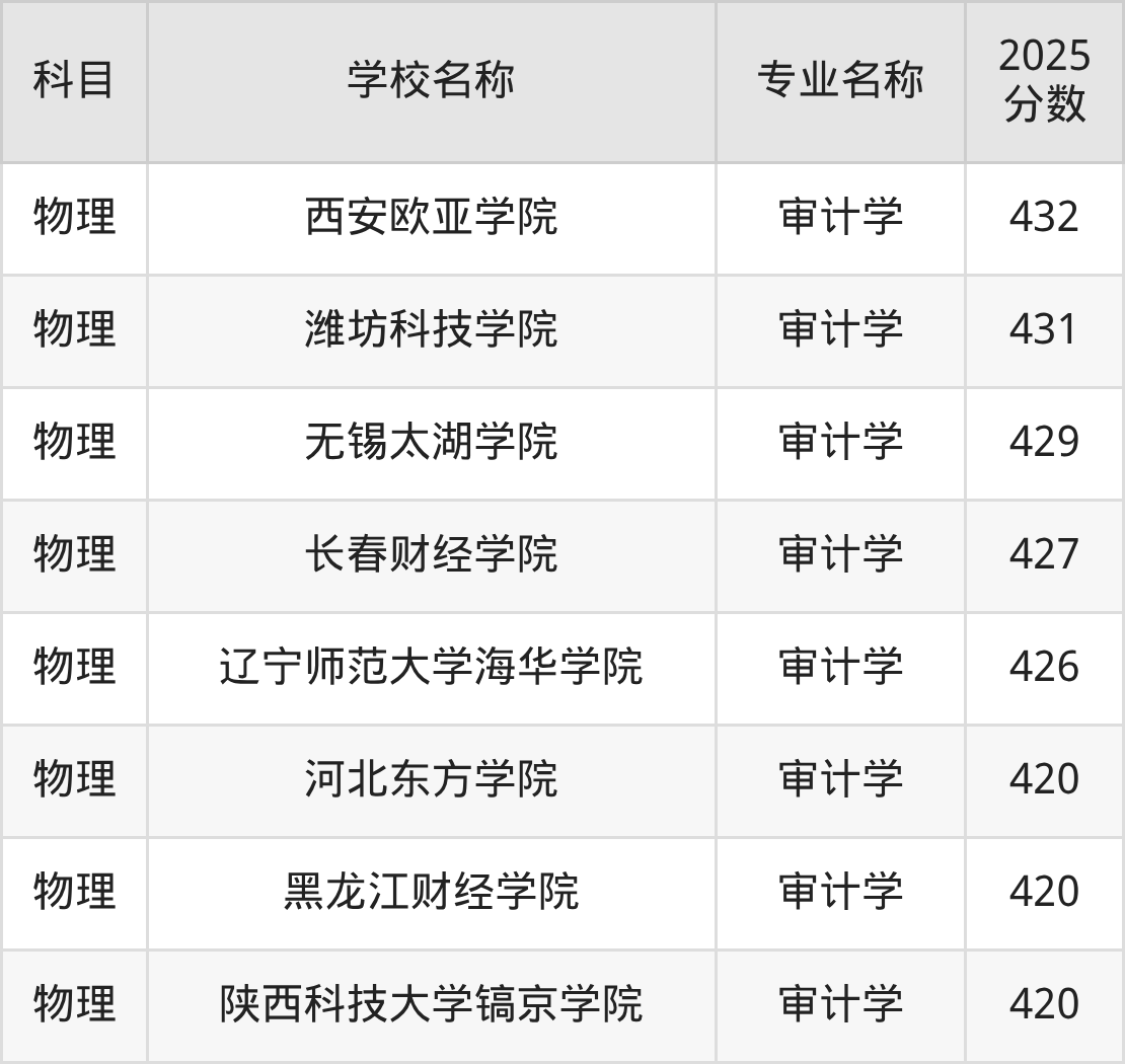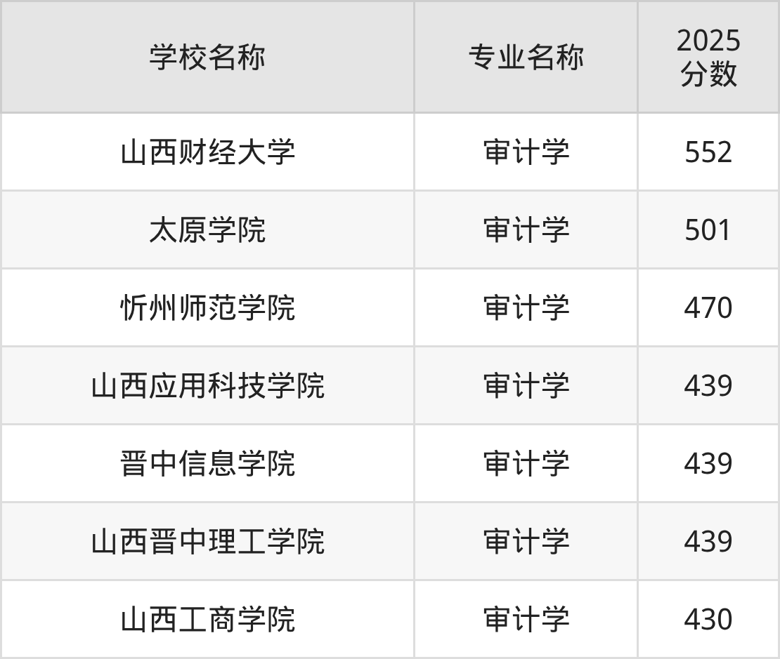 通过上文大家可以知晓,在山西省内招审计学专业的院校数量较少,所以下文将为2026届高考生继续展示:省外大学的审计学专业2025年在山西高考的录取情况,包含上海财经大学、南京审计大学、上海立信会计金融学院、安徽财经大学、山东财经大学。
